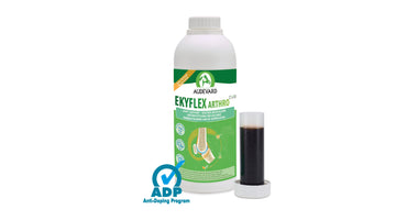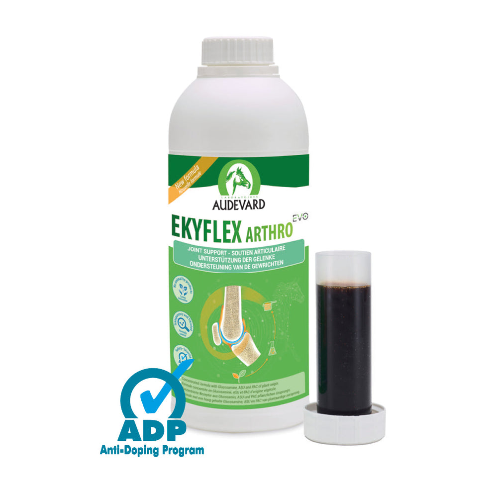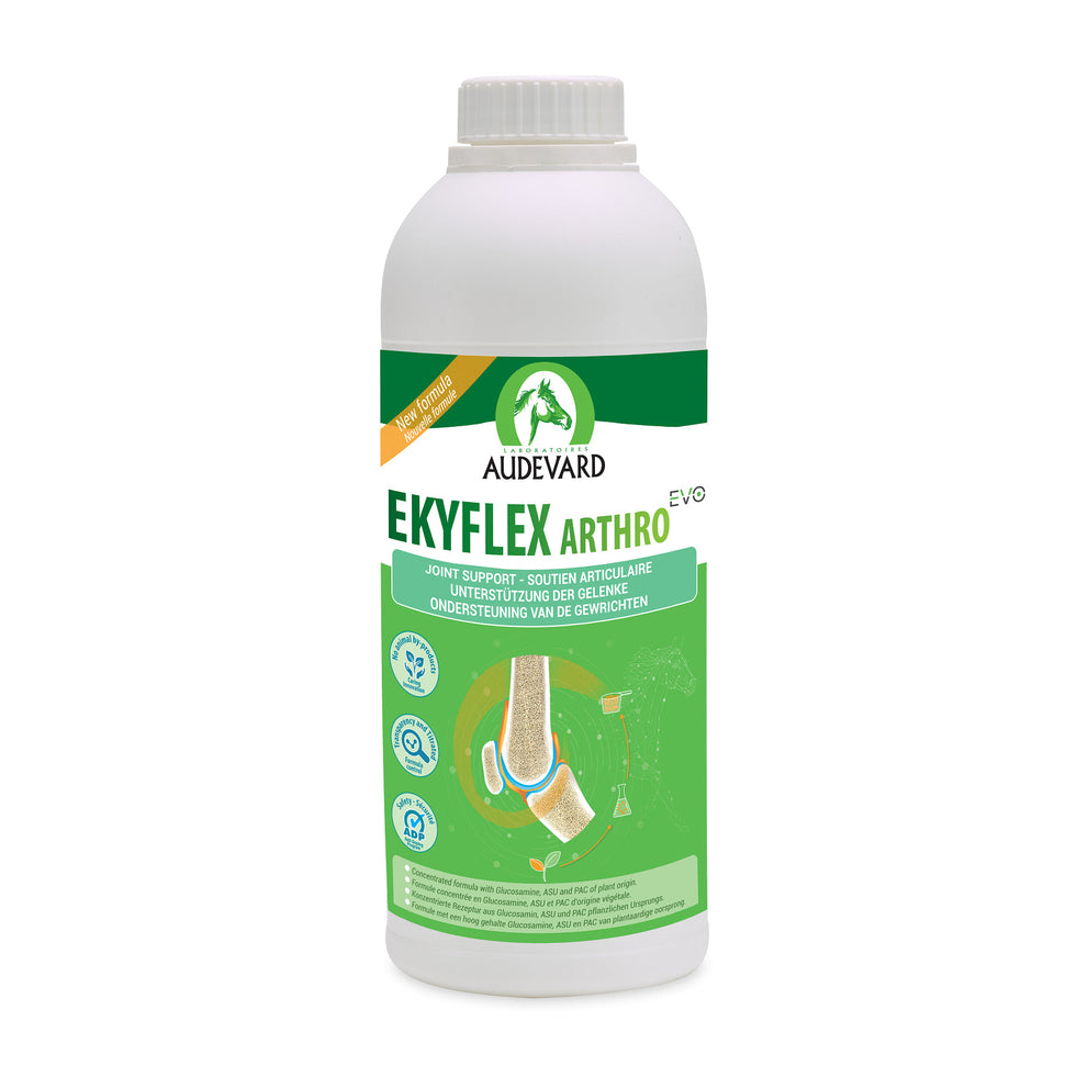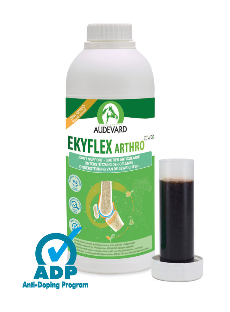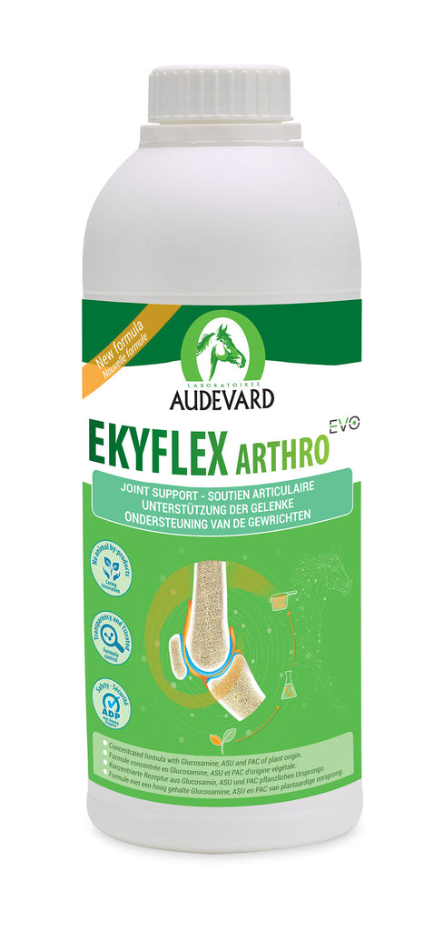 Audevard Ekyflex Arthro EVO Solution is een dopingvrij aanvullend diervoeder voor paarden dat drievoudige bescherming biedt aan de gewrichten. De geconcentreerde en complementaire ingrediënten bieden een uitgebreide ondersteuning aan zowel het kraakbeen, synoviaal vocht als het subchondraal bot.