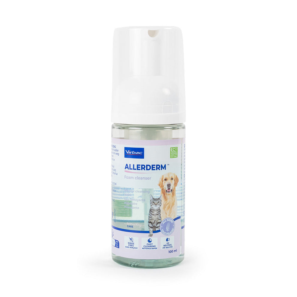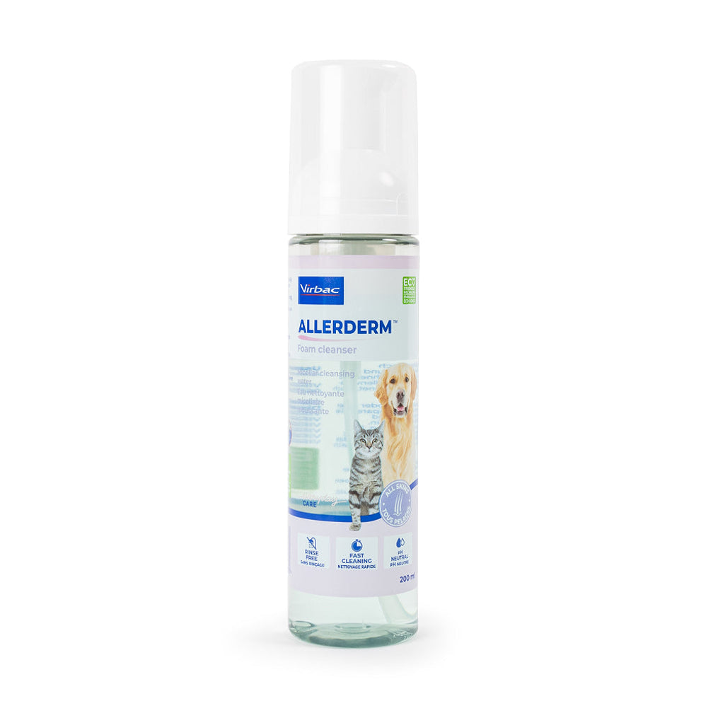 Allerderm Foam Cleanser van Virbac is een micellair reinigingsschuim voor de vacht van de hond en de kat. Allerderm Foam is gemakkelijk in gebruik en dient voor een milde en snelle reiniging van de huid en vacht van uw huisdier tussen wasbeurten door.