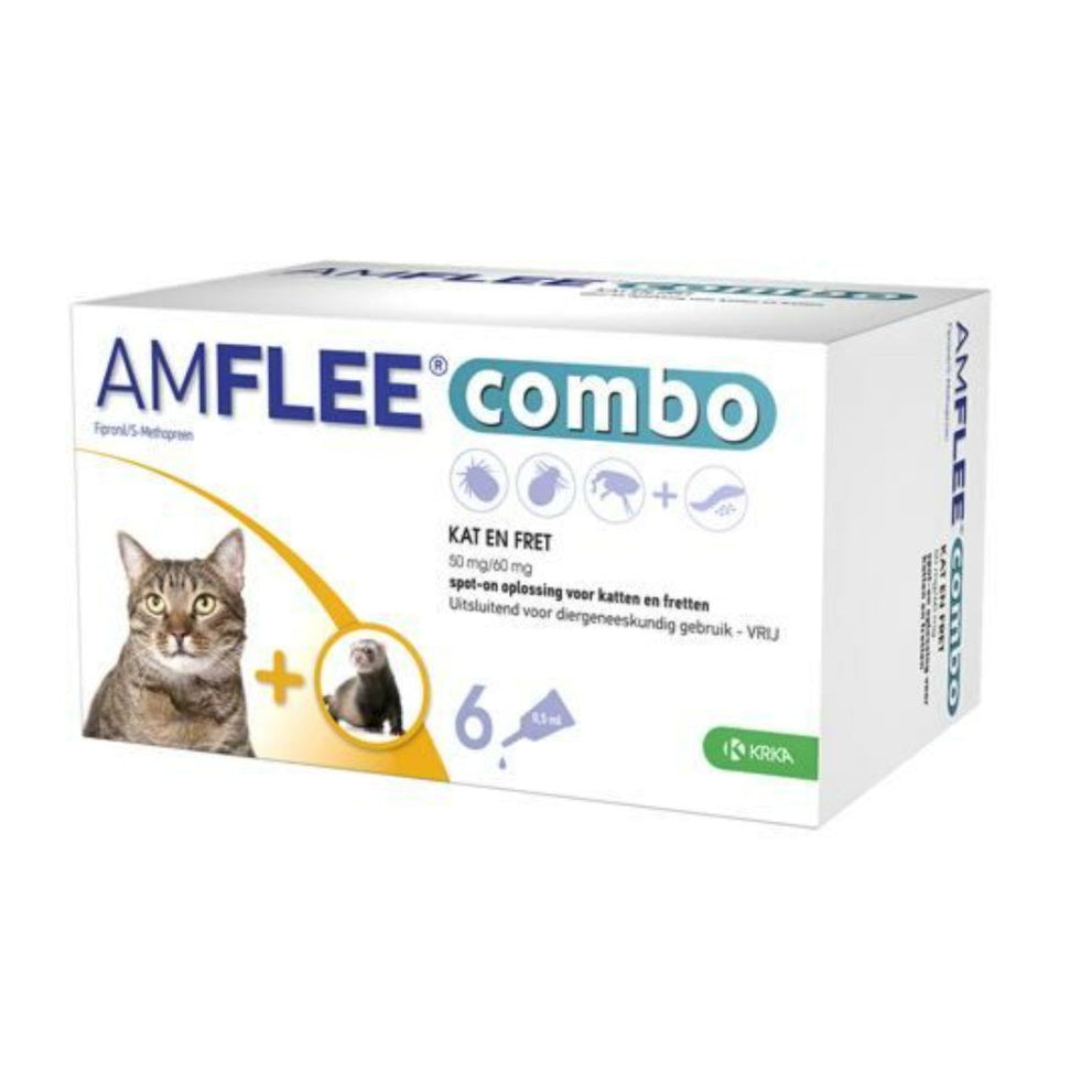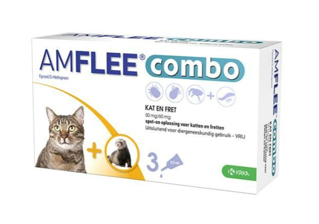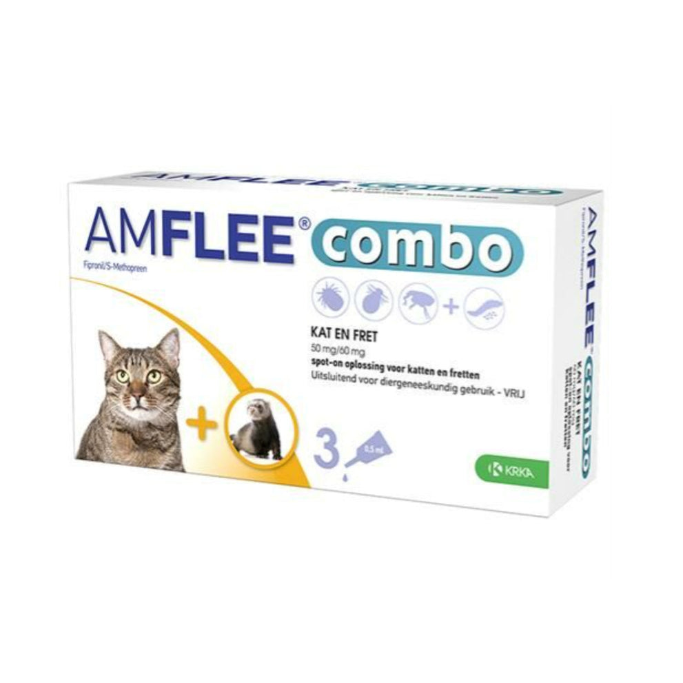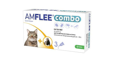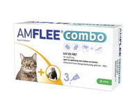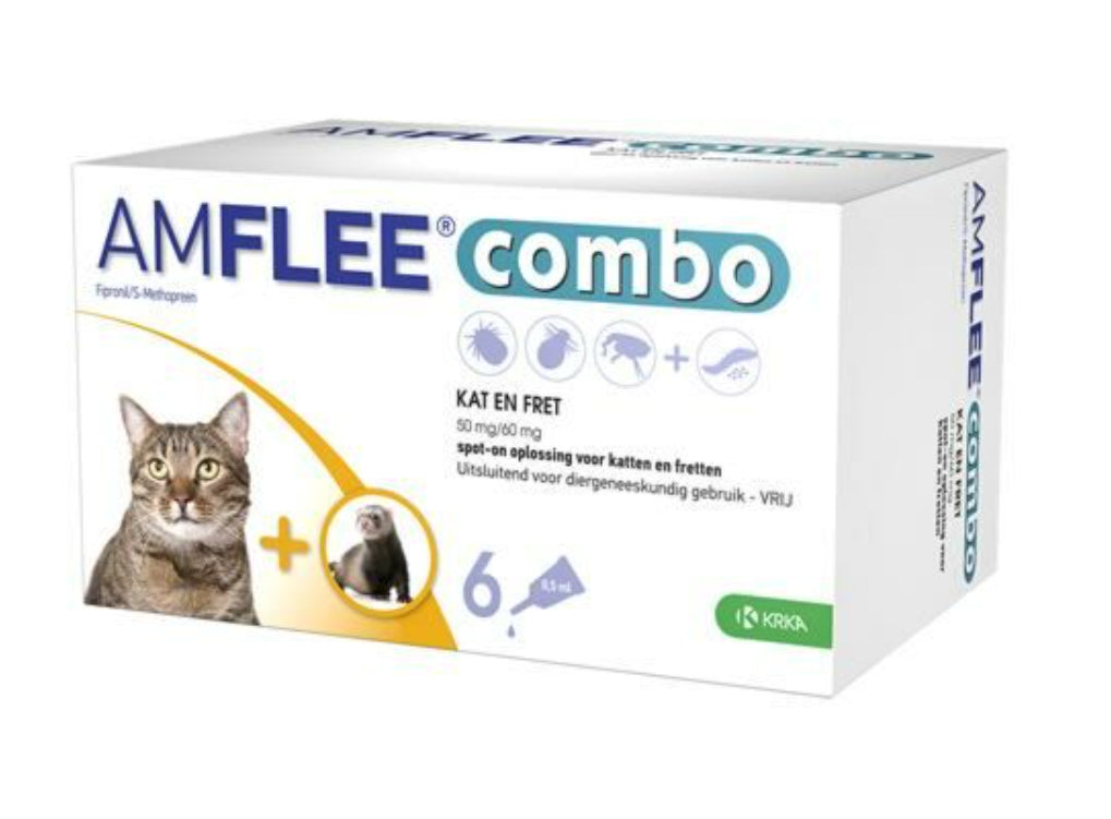 Amflee Combo Spot-on kan curatief en preventief ingezet worden tegen vlooien, teken en bijtende luizen bij katten en fretten. Naast dat het middel werkzaam is tegen volwassen vlooien remt het ook de ontwikkeling van vlooieneitjes, -larven en -poppen in de omgeving.