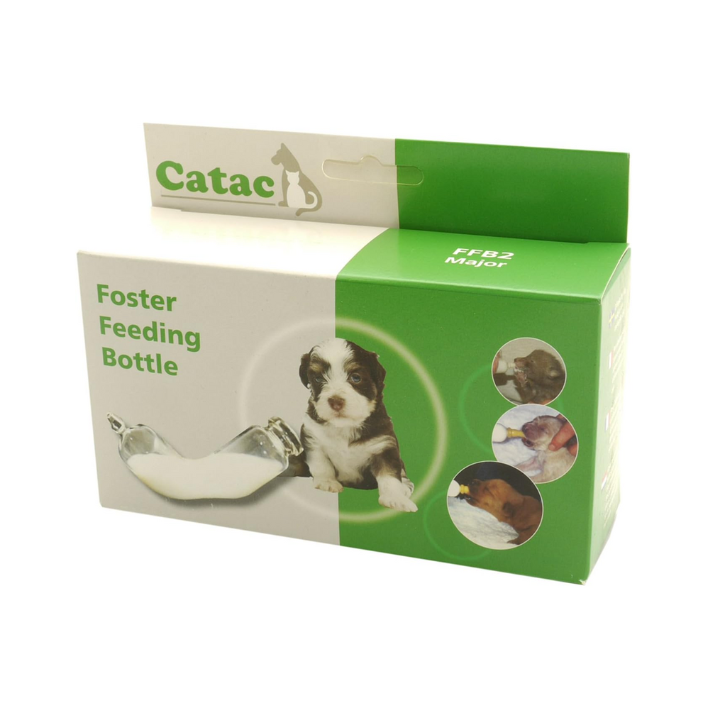 De Catac zuigfles is een complete set om puppy's met de hand mee te voeden. Dit kan bijvoorbeeld het geval zijn bij moederloze dieren, bij dieren waar de moeder te weinig melk geeft of voor het bijvoeden bij dieren die te licht in lichaamsgewicht zitten. De fles is gemaakt van stevig glas en doormiddel van de opening aan de achterkant is de hoeveelheid melk veilig te reguleren. De speentjes zijn los bij te bestellen in drie verschillende maten.