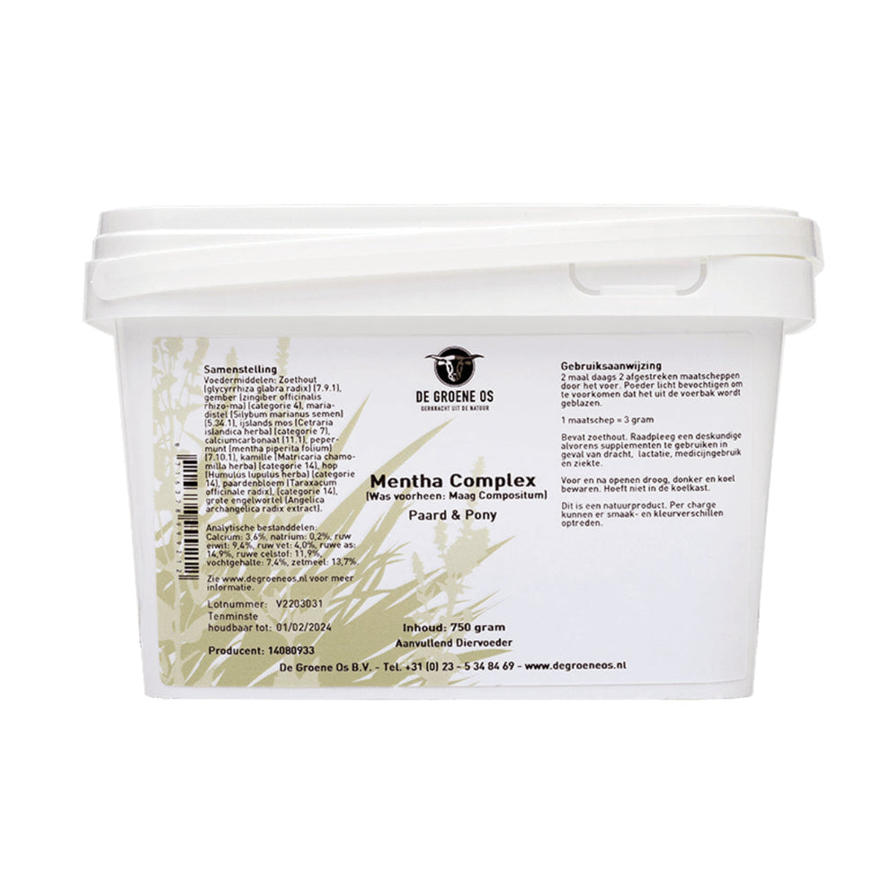 De Groene Os Mentha Complex (voorheen De Groene Os Maag Compositum) is een 100% natuurlijke aanvullend diervoeder ter ondersteuning van de maag, lever en de spijsvertering bij paard en pony. Het middel werkt verzachtend op de slijmvliezen en helpt om de normale zuurgraad van de maag in stand te houden.