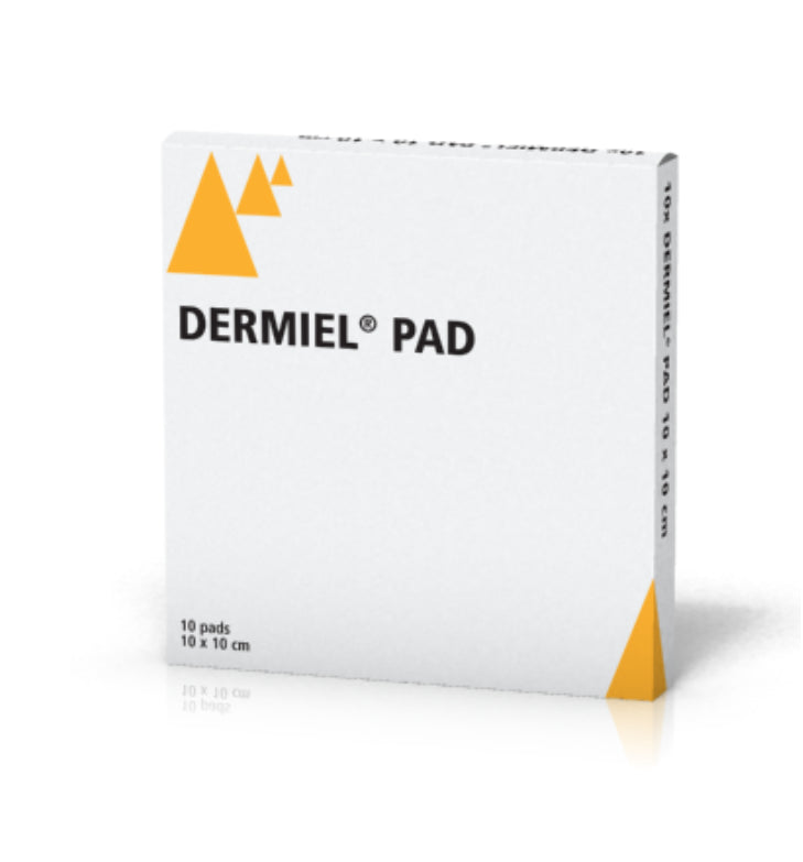 De Dermiel pads zijn steriele wondbedekkers voor oppervlakkige wonden. Ze bestaan uit een absorptielaag van natuurlijke viscose die is gecoat met een laagje niet-verklevende polyethyleen. De binnenste laag is geïmpregneerd met een geringe hoeveelheid vloeistof op basis van honing en glycerol, waardoor Dermiel pads licht vochtig zijn.