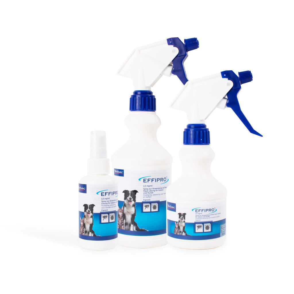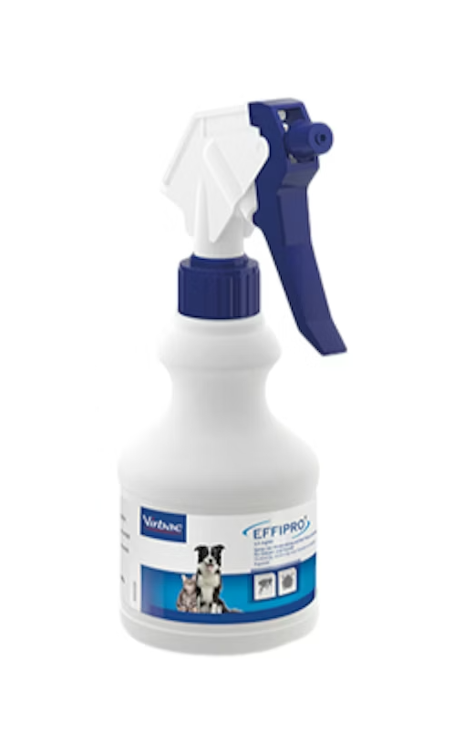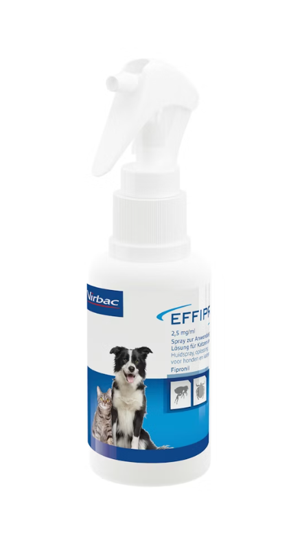 Effipro Spray is een anti-vlooien, -teken en -luizen spray op basis van Fipronil voor honden en katten. Bij de hond is deze tegen vlooien tot 3 maanden en tot 4 weken werkzaam tegen teken (afhankelijk van de omegevingsdruk). Bij katten is de Effipro Spray tot 6 weken tegen vlooien en tot 4 weken tegen teken werkzaam. Puppy’s en kittens vanaf 2 dagen oud kunnen veilig worden behandeld.
