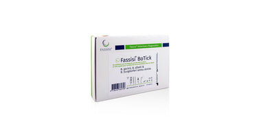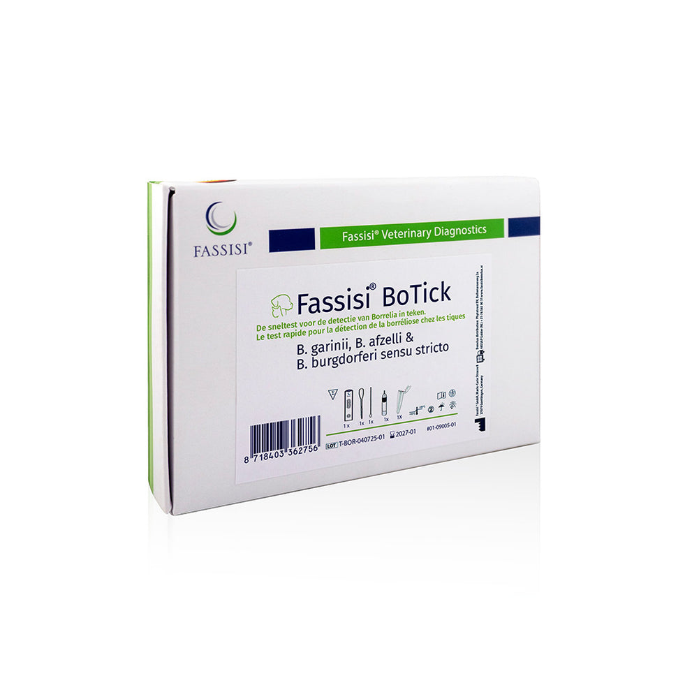 De Fassisi BoTick Teken Zelftest is een sneltest voor detectie van Borrelia in teken. Kwalitatieve detectie van Borrelia (B. garinii, B. afzelii, B. burgdorferi sensu stricto, B. spielmanii) in teken.