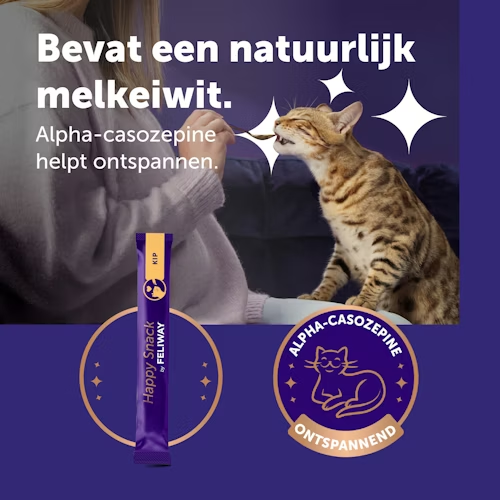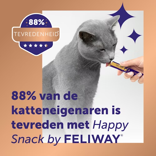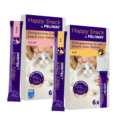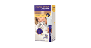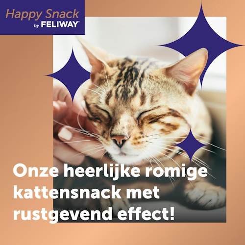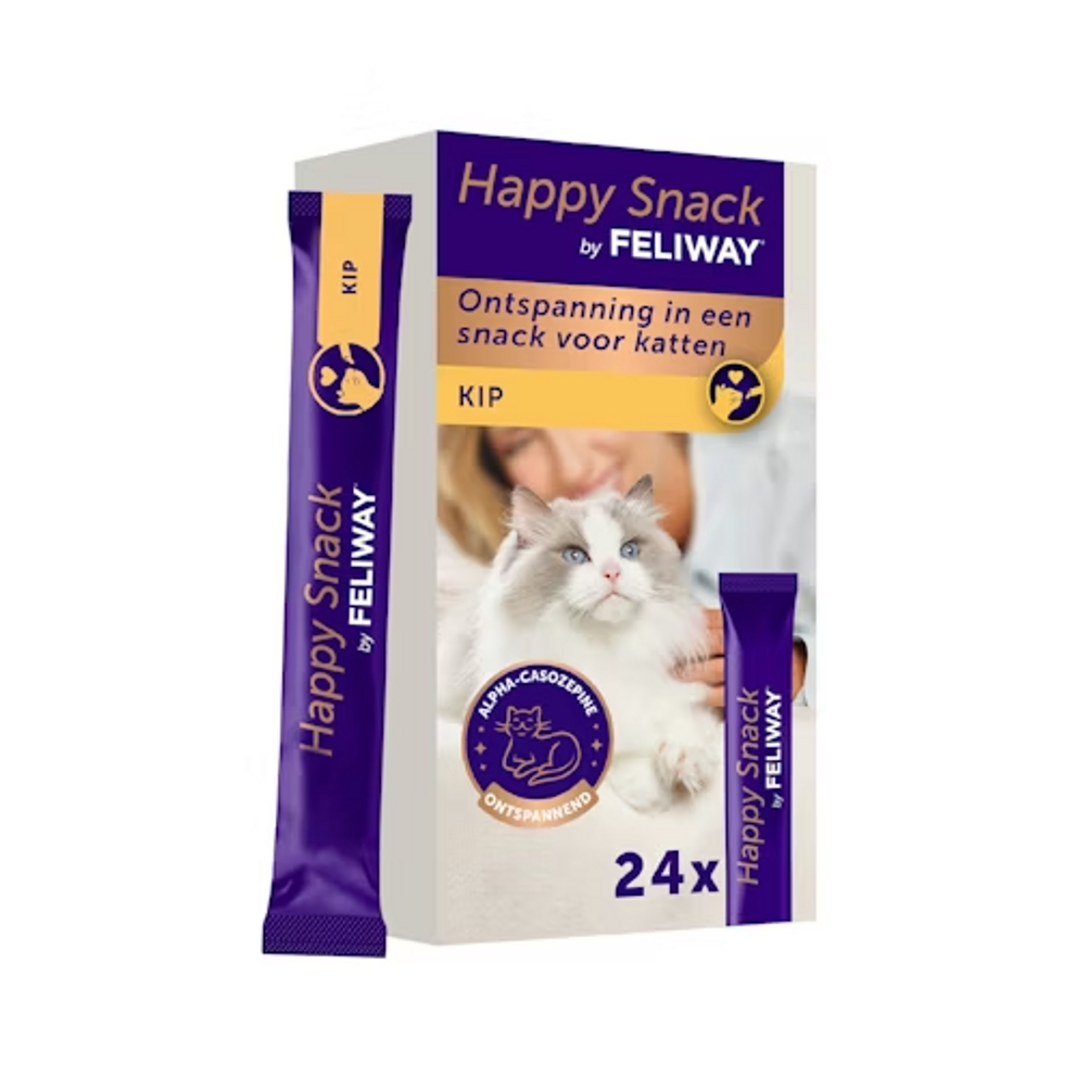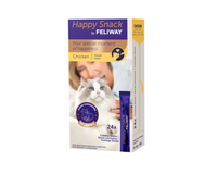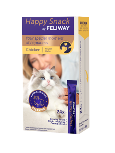 Feliway Happy Snack is een smakelijke snack met kipsmaak dit ingezet kan worden ter ondersteuning van stress situaties bij katten. De snack is licht en romig en het bevat alfa-casozepine, een natuurlijk melkeiwit met bekende ontspannende eigenschappen. Deze snack is caloriearm, glutenvrij, suikervrij en vrij van kunstmatige kleurstoffen en conserveermiddelen.