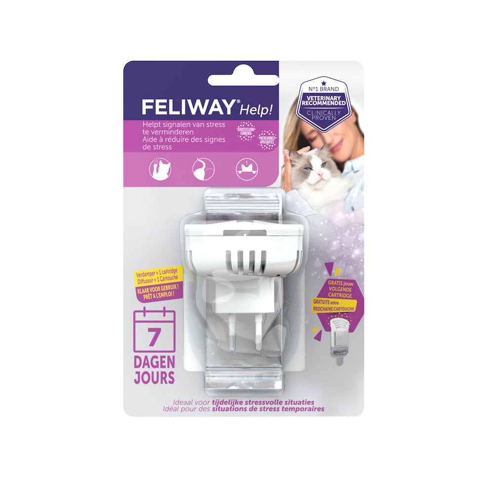 De Feliway Help! is een verdamper (voor in het stopcontact) op basis van geruststellende feromonen voor katten. De geruststellende feromonen zorgen ervoor dat uw kat zich gedurende 7 dagen veilig en comfortabel voelt in z'n eigen omgeving. De Feliway Help! kan onder andere tegen stresssignalen zoals te verminderen zoals: