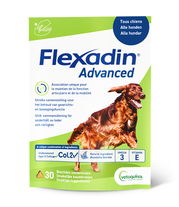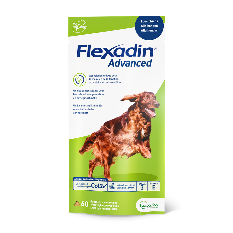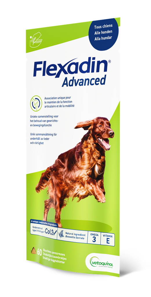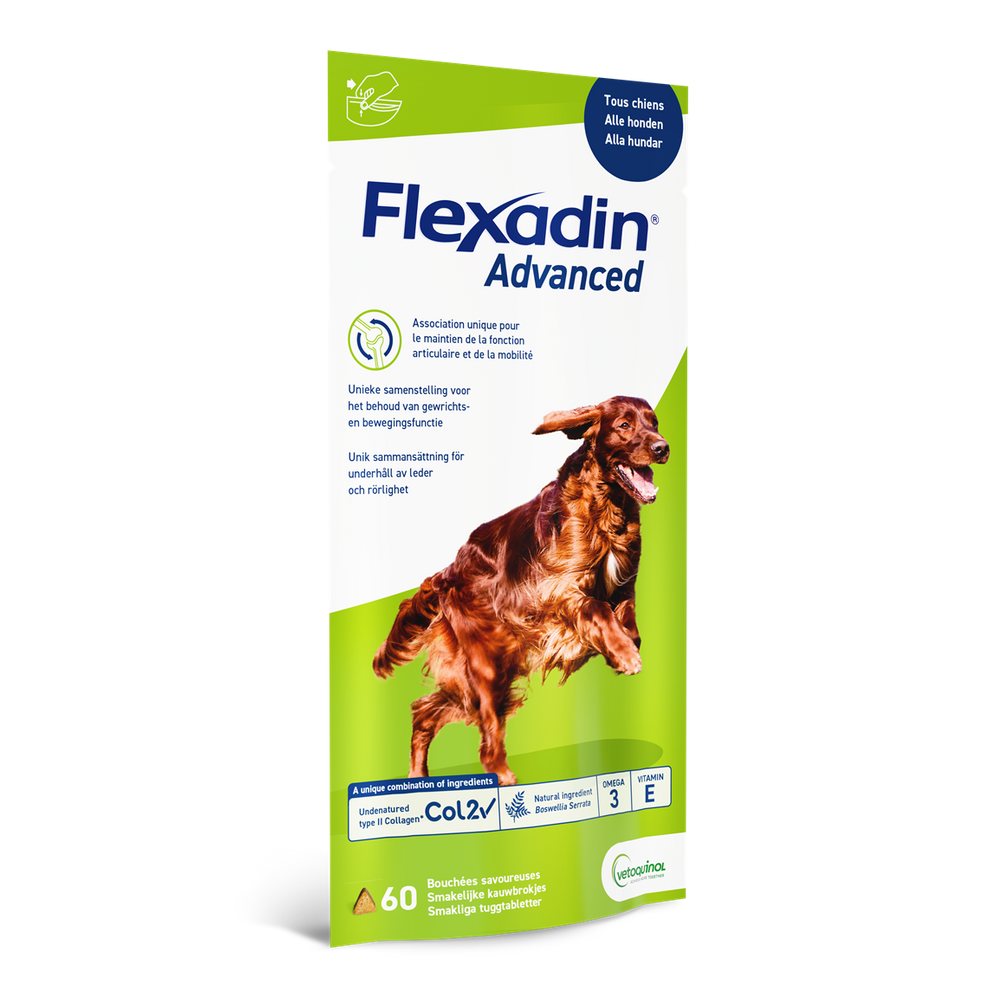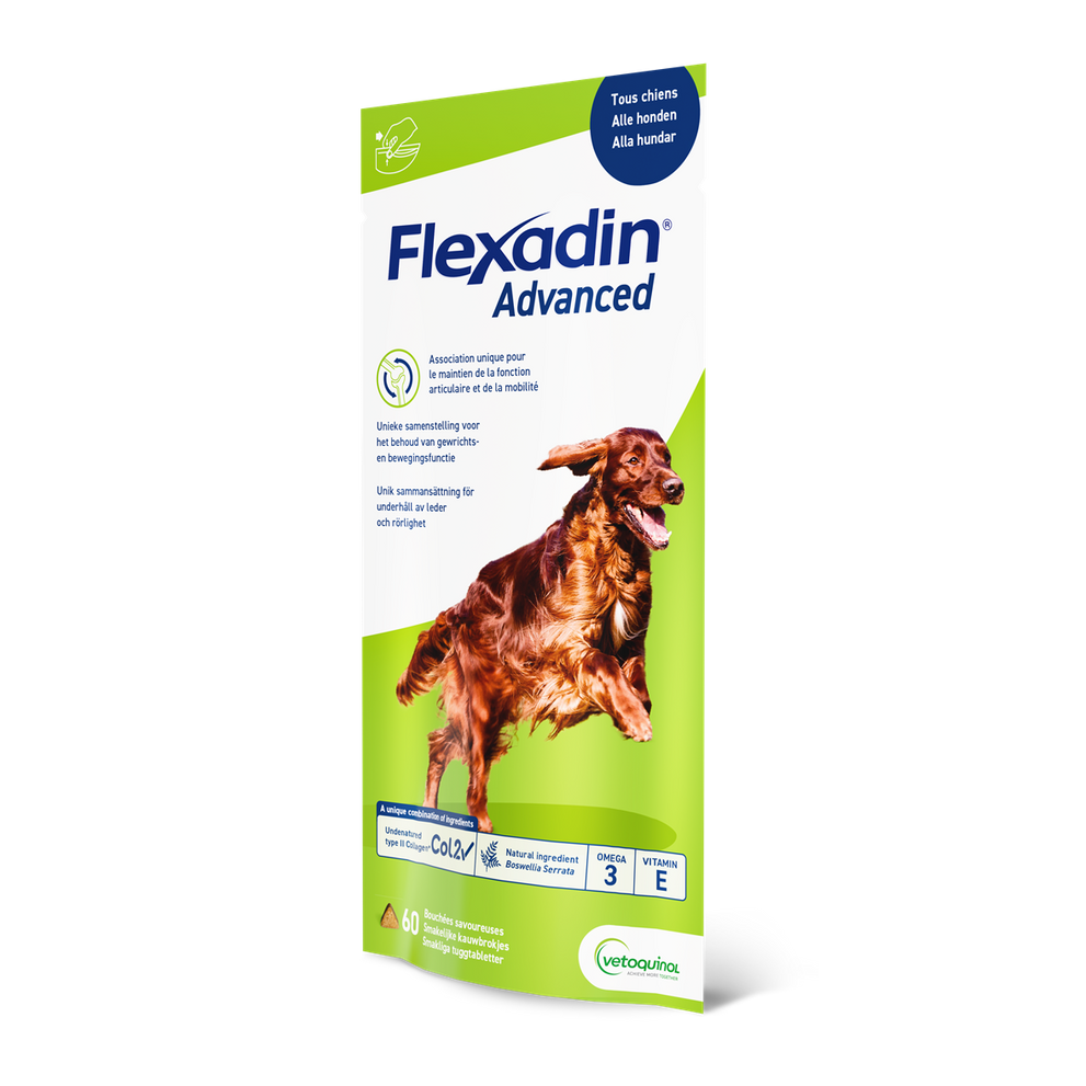 Flexadin Advanced bevat een innovatieve combinatie van hoogwaardige, natuurlijke ingrediënten die de gewrichts- en bewegingsfunctie van je hond ondersteunen. De unieke combinatie van UC-II®, Boswellia Serrata, Omega 3-vetzuren en Vitamine E zorgen voor een optimale ondersteuning van de gewrichten van je hond.