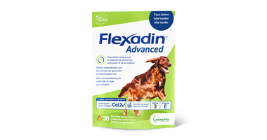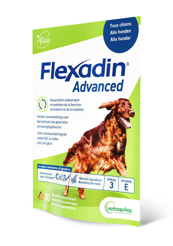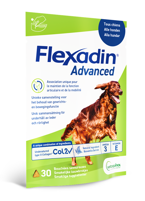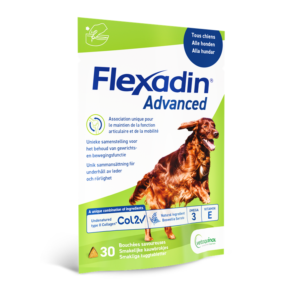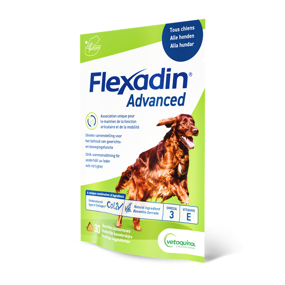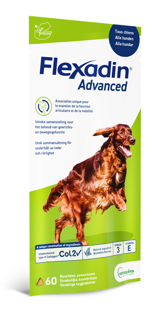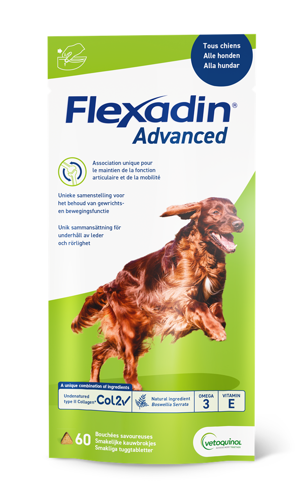 Flexadin Advanced bevat een innovatieve combinatie van hoogwaardige, natuurlijke ingrediënten die de gewrichts- en bewegingsfunctie van je hond ondersteunen. De unieke combinatie van UC-II®, Boswellia Serrata, Omega 3-vetzuren en Vitamine E zorgen voor een optimale ondersteuning van de gewrichten van je hond.