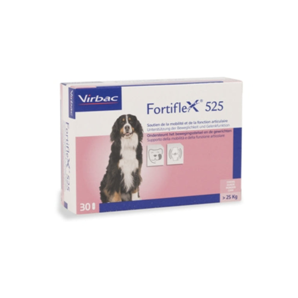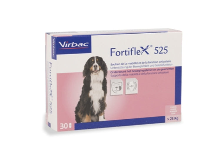 De smakelijke Fortiflex 525 tabletten kunnen veilig langdurig gegeven worden. De dosering is 1 tablet per dag direct in de bek of door de dagelijkse voeding. Een kuur duurt 30 dagen en kan 3 tot 4 maal per jaar gegeven worden. Bij zeer ernstige artrose kan dit product voortdurend gegeven worden. De Fortiflex 525 kan i.c.m. medicatie gegeven worden.
