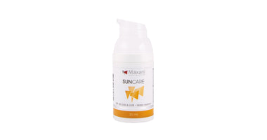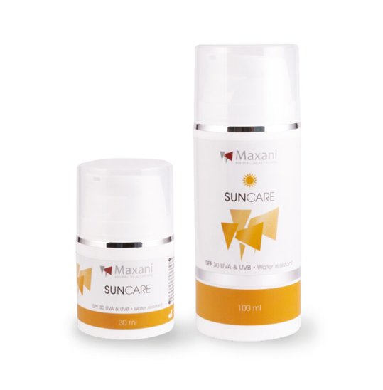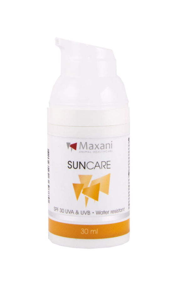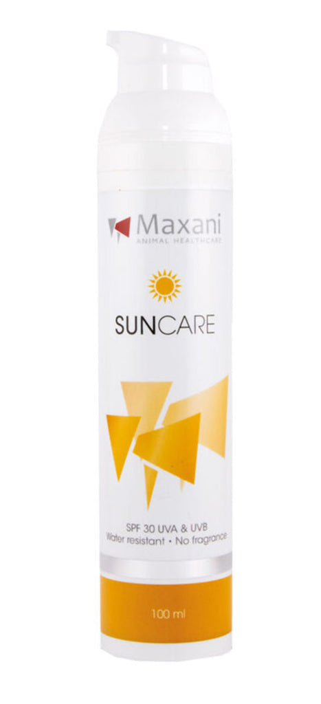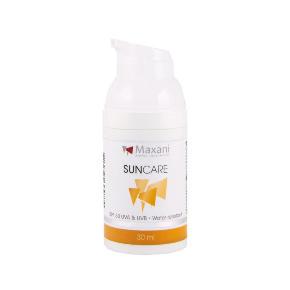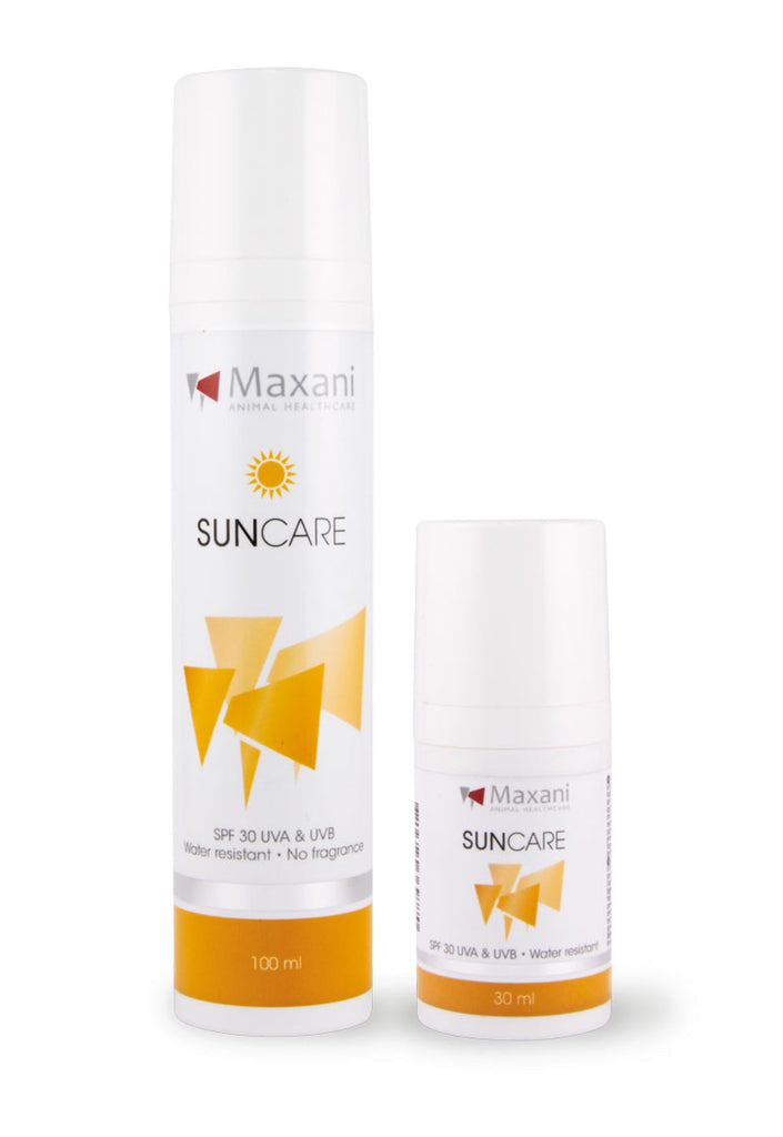 De SunCare van Maxani is een zonnebrandcrème speciaal ontwikkeld voor honden, katten, konijnen, knaagdieren en paarden. Deze goed smeerbare zonnebrandcrème geeft een hoge bescherming tegen schadelijke UV stralen, zonder een witte waas achter te laten. Bevat effectieve en veilige zonnefilters voor huisdieren, zonder parfum.
