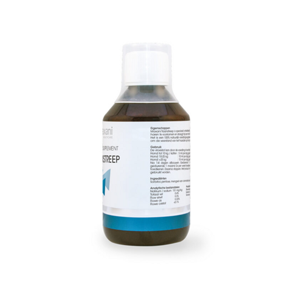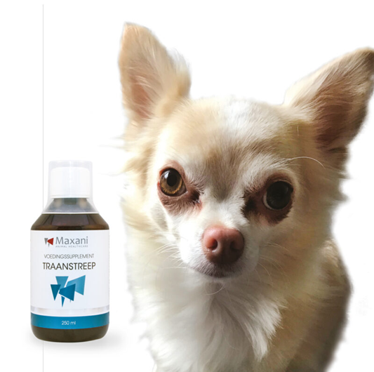 Maxani Traanstreep Voedingssupplement (orale toediening) is een 100% natuurlijk product dat de traanbuis van honden, katten en konijnen reinigt. Het is speciaal ontwikkeld om traanstrepen en verkleuring van de vacht rondom de ogen te verminderen en draagt bij aan het verhelpen van een verstopte traanbuis. Soms is de traanbuis vervormd, waardoor hier vuil in ophoopt.