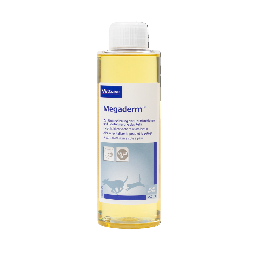 De Megaderm bevat een handig doseersysteem waarmee u via de doseerkamer eenvoudig kunt doseren. U kunt deze vullen tot aan de maatstreep wat gelijk is aan 1 dosis van 5 ml. U kunt de Megaderm over de dagelijkse voeding van uw hond en/of kat toedienen. Voor een optimaal effect dient de Megaderm minimaal 6 weken toegediend te worden.