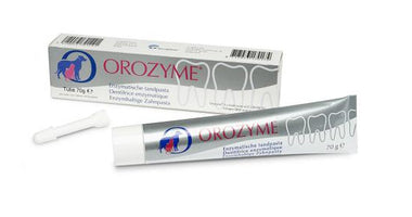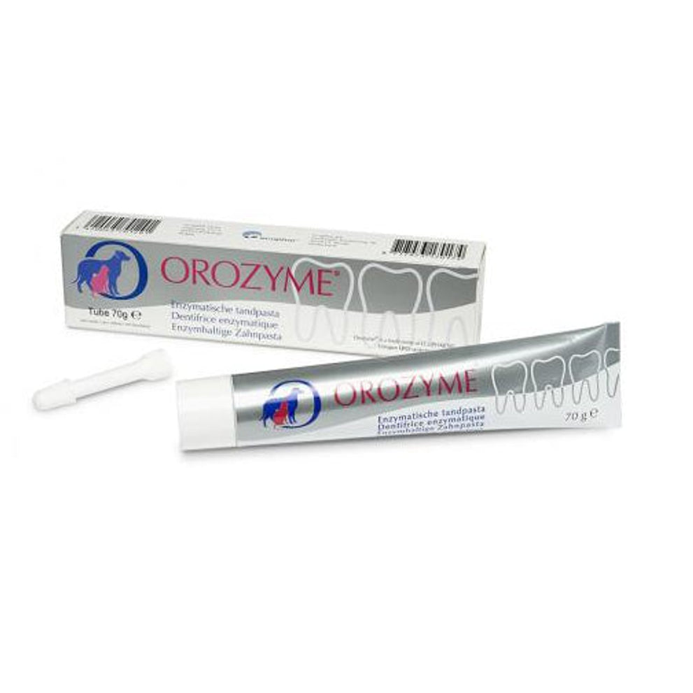 Orozyme Enzymatische Tandpasta is een smakelijke hypoallergene tandpasta met moutsmaak, verrijkt met een enzymatisch complex voor honden en katten. Naast het verwijderen van tandplak door de mechanische werking van het poetsen, wordt de mondflora gezond gehouden dankzij de enzymatische werking en stinkt het dier minder uit de bek.