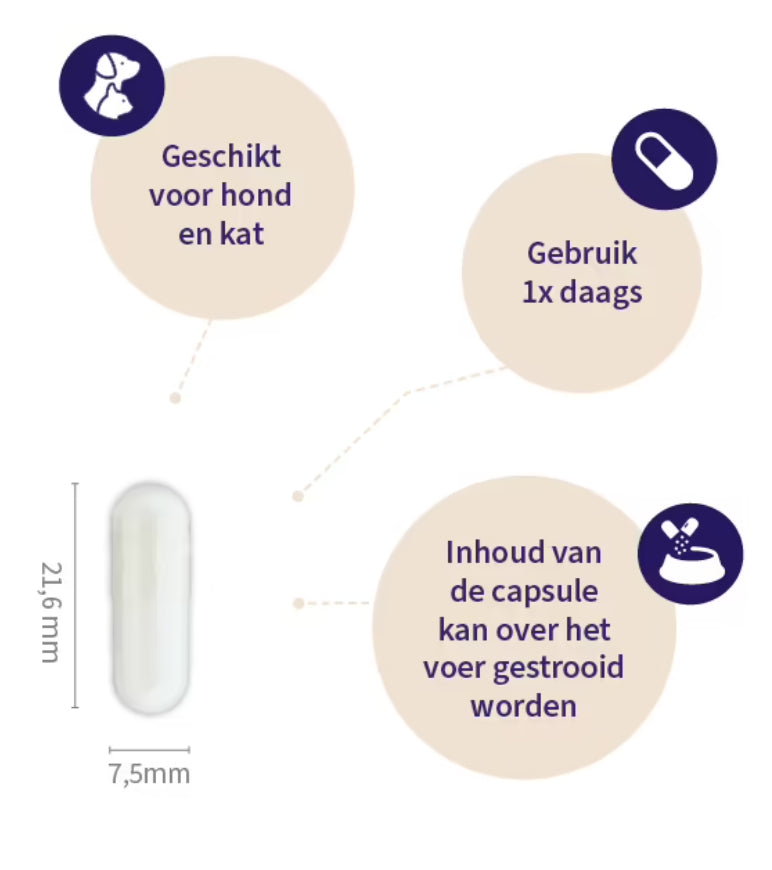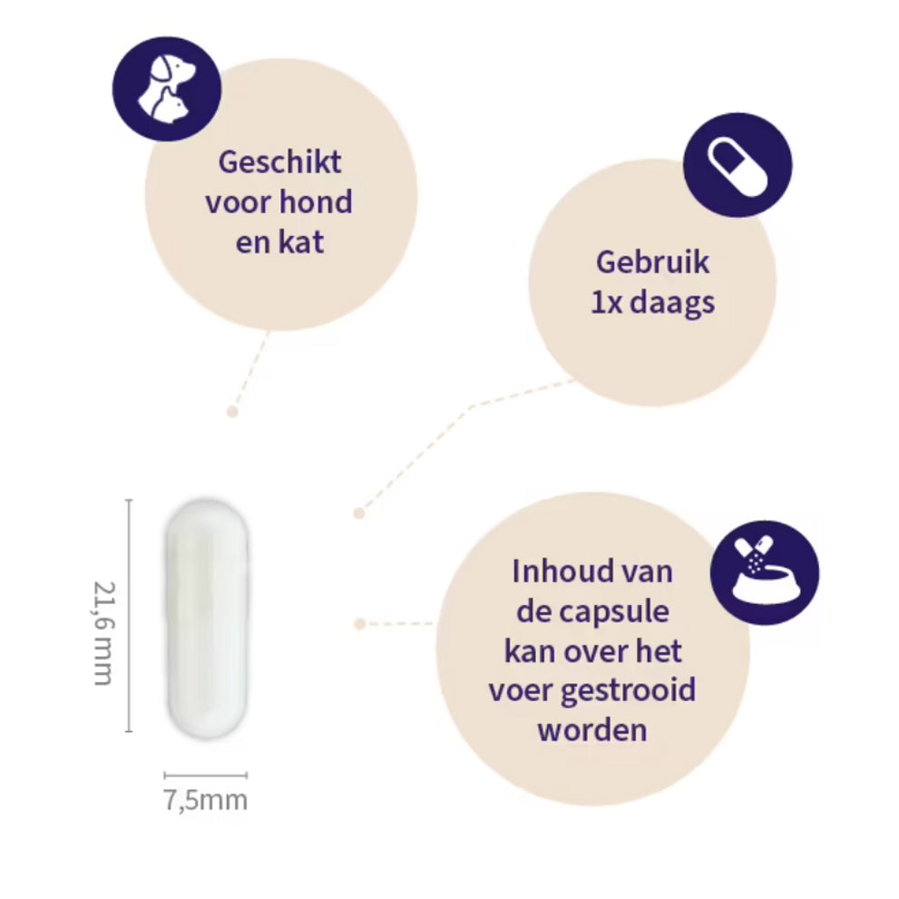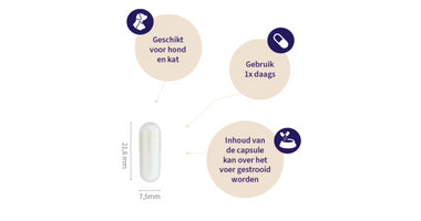 TIP: Vind je dier het lastig om een capsule in te nemen? Je kan de capsule ook openmaken en het poeder over het voer strooien. Wanneer het los over het voer wordt gegeven, dien je het poeder te bevochtigen zodat het niet uit de voerbak geblazen wordt.