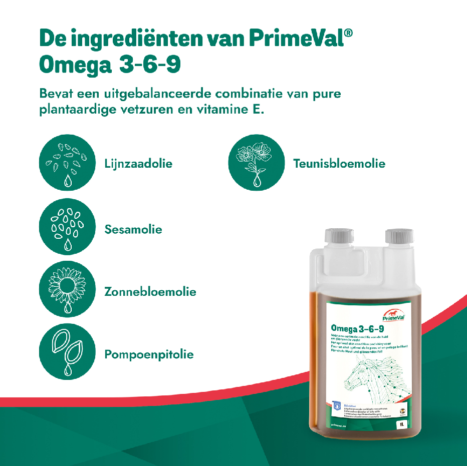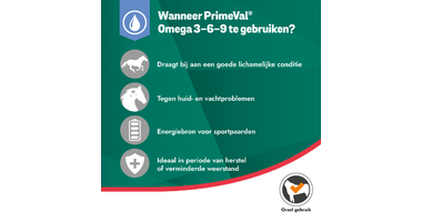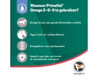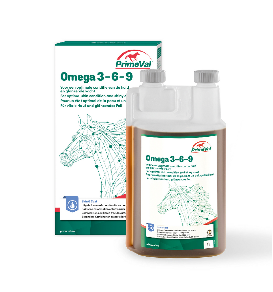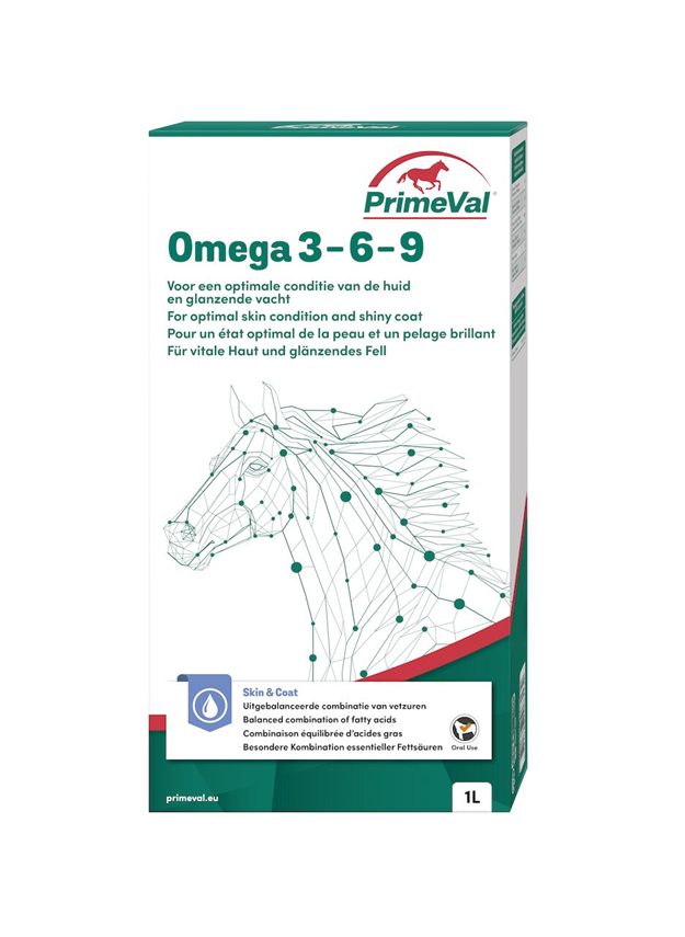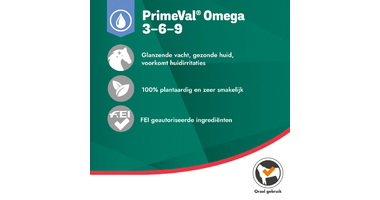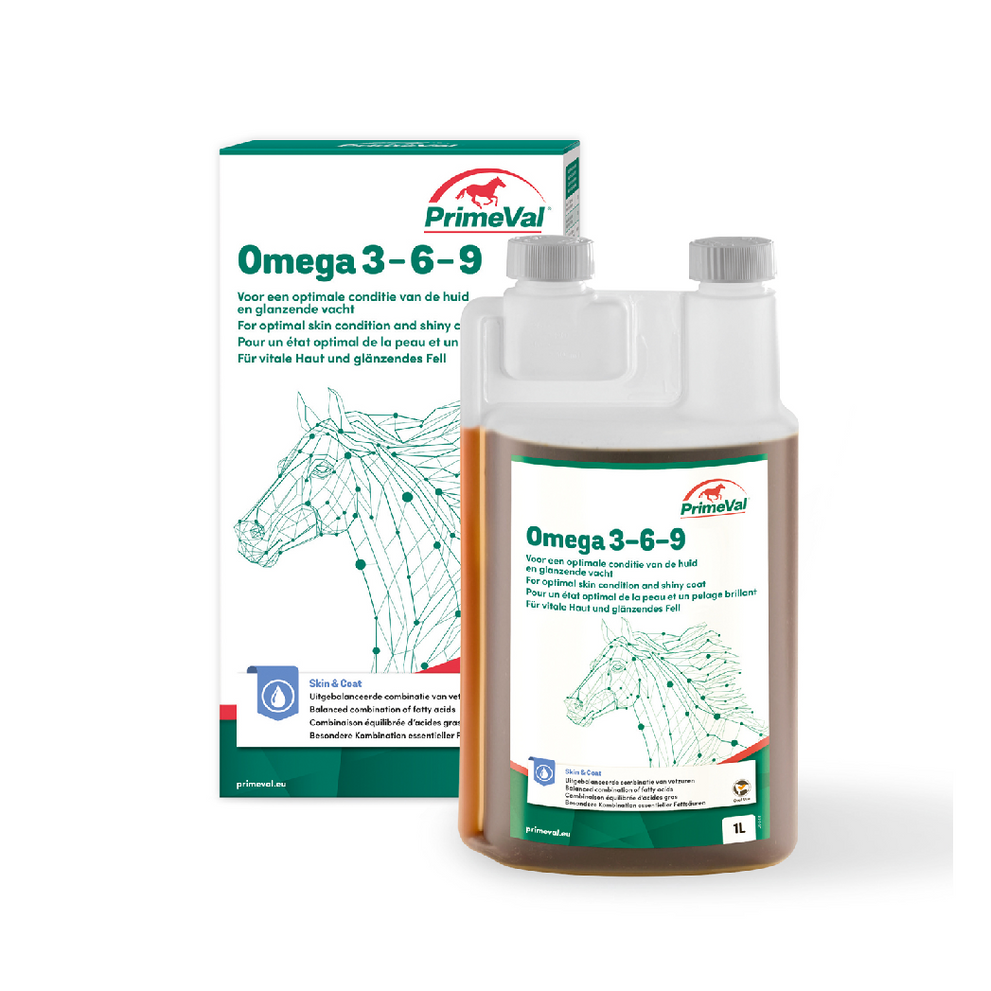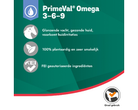 PrimeVal Omega 3-6-9 bevat een uitgebalanceerde combinatie van puur plantaardige omega 3, 6 en 9 vetzuren. Deze meervoudig onverzadigde vetzuren helpen de huid in een optimale conditie te houden en de vacht een mooie glans te geven. Geschikt voor  dagelijks gebruik maar ook in tijden van herstel na ziekte, stressvolle situaties en verminderde weerstand. Sportpaarden profiteren van extra vetzuren als energiebron. PrimeVal Omega 3-6-9 is een waardevolle aanvulling op het dagelijkse rantsoen van het paard.
