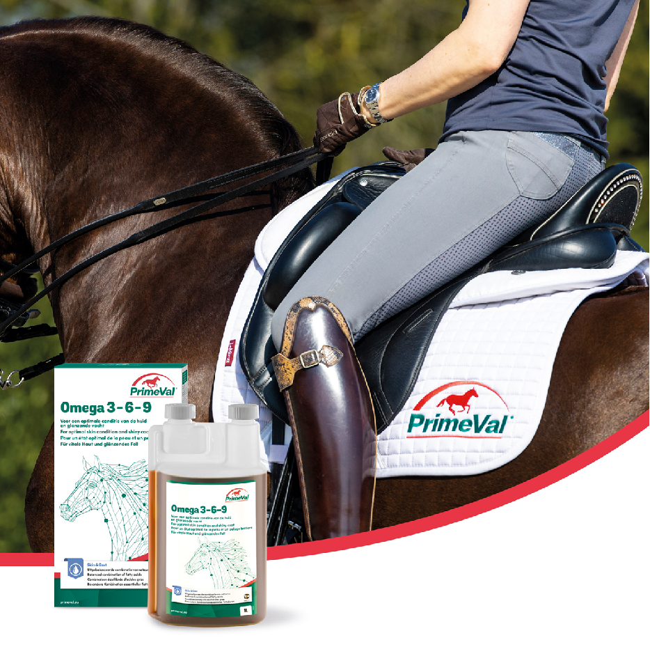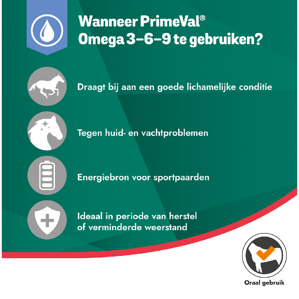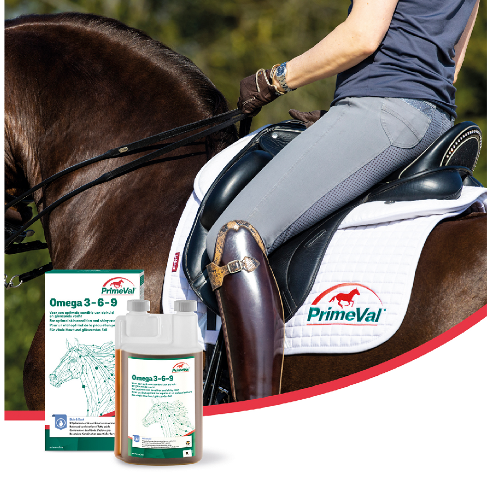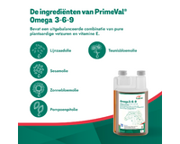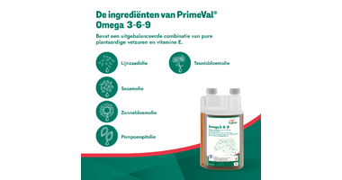 PrimeVal Omega 3-6-9 bevat een uitgebalanceerde combinatie van puur plantaardige omega 3, 6 en 9 vetzuren. Deze meervoudig onverzadigde vetzuren helpen de huid in een optimale conditie te houden en de vacht een mooie glans te geven. Geschikt voor  dagelijks gebruik maar ook in tijden van herstel na ziekte, stressvolle situaties en verminderde weerstand. Sportpaarden profiteren van extra vetzuren als energiebron. PrimeVal Omega 3-6-9 is een waardevolle aanvulling op het dagelijkse rantsoen van het paard.