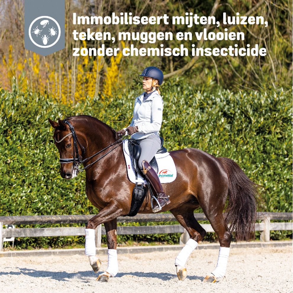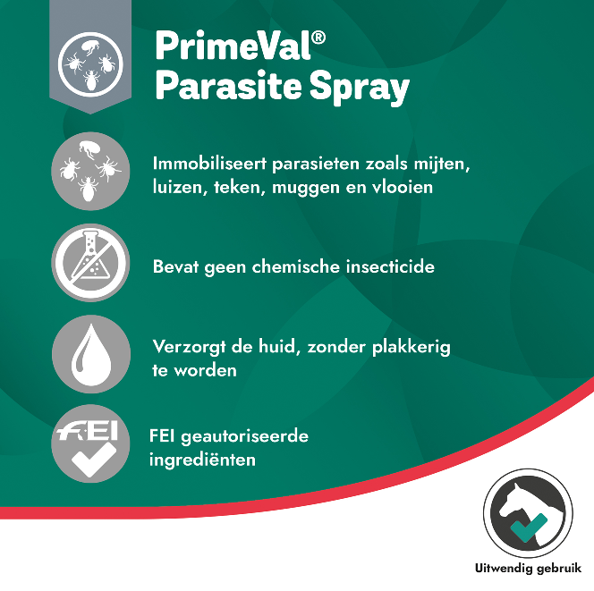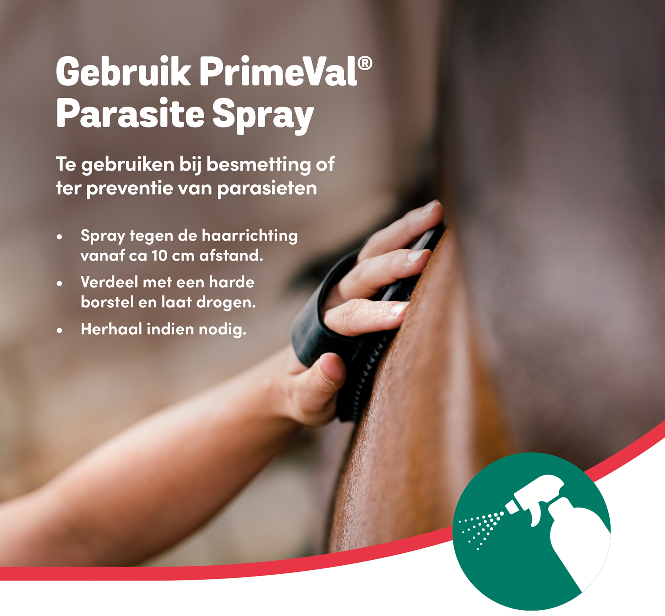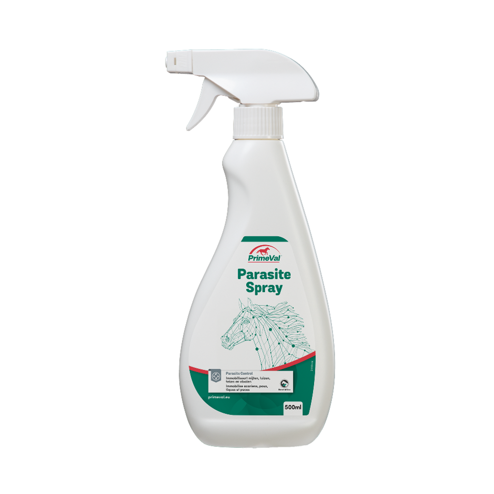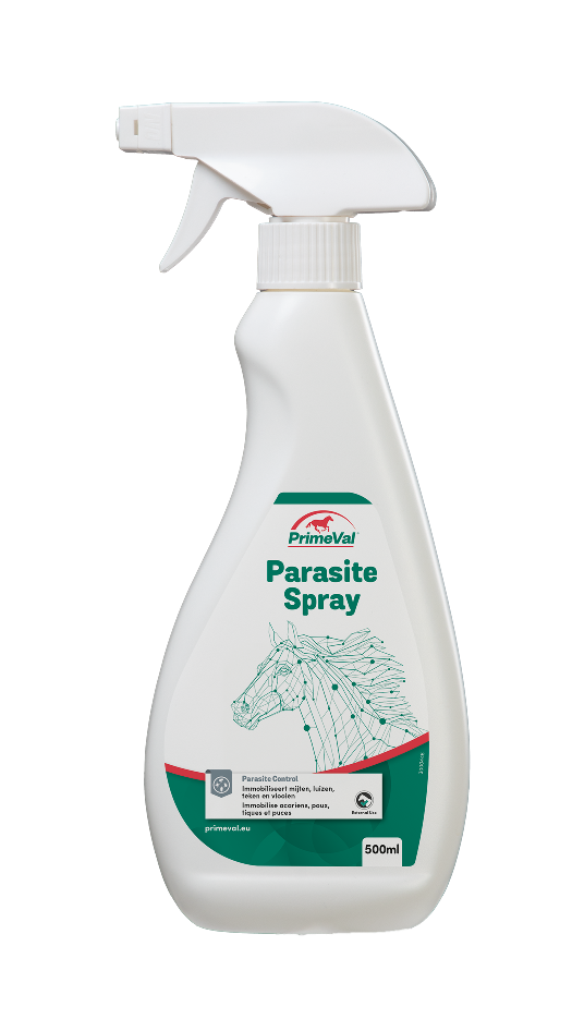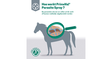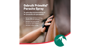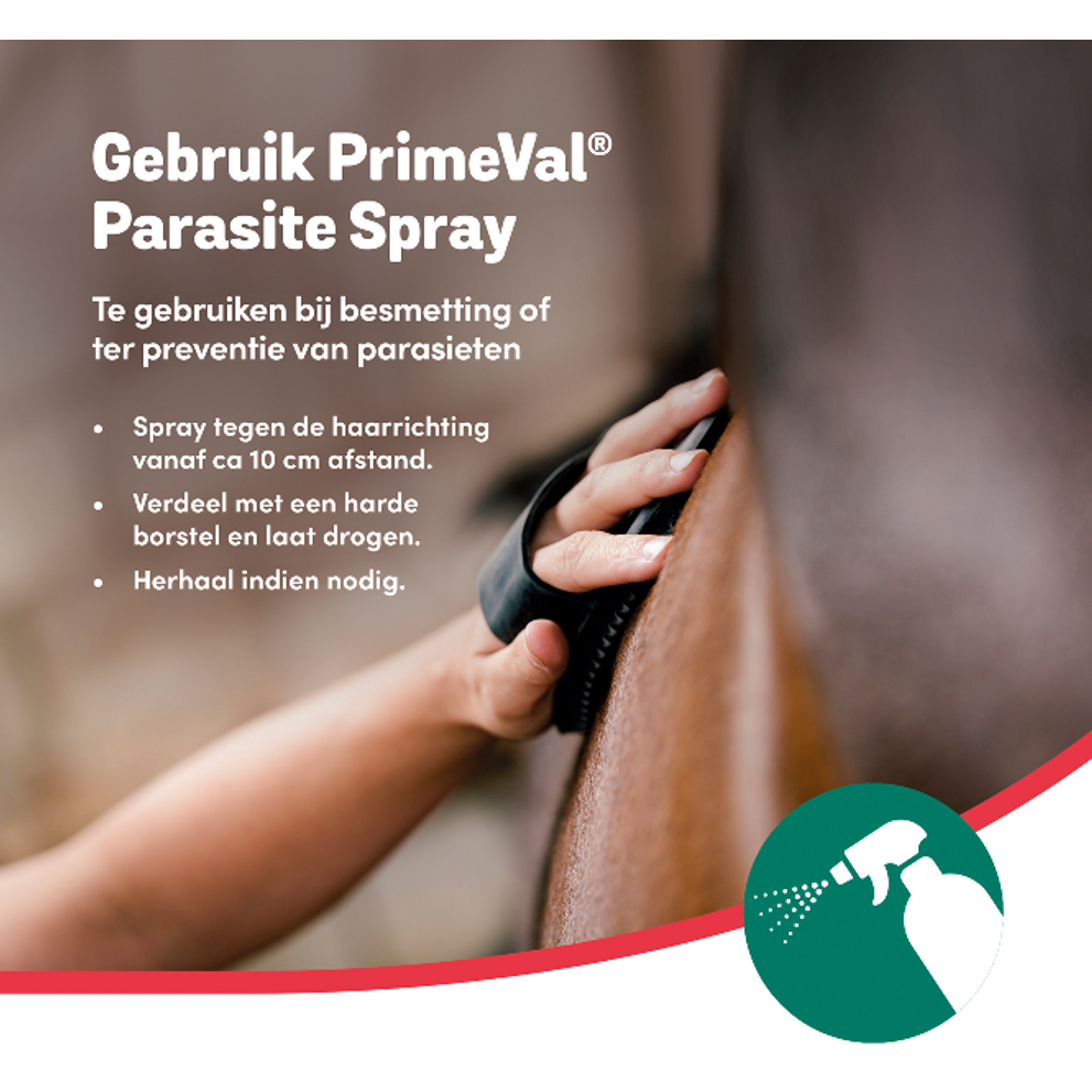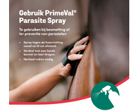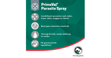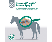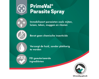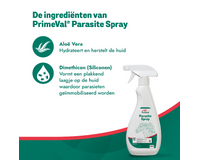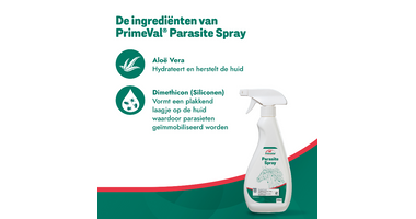 PrimeVal Parasite Spray immobiliseert parasieten zoals mijten, luizen, teken, muggen en vlooien op puur fysieke wijze. PrimeVal Parasite Spray bevat geen (chemische) insecticiden, maar siliconen (Dimethicon) die een plakkend laagje om de parasieten aanbrengen. Hierdoor kunnen ze niet meer bewegen en vallen ze spontaan uit de vacht of kunnen eenvoudig uitgeborsteld worden.