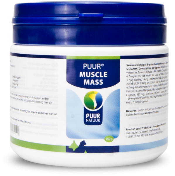 PUUR Muscle mass is een aanvullend diervoeder voor honden en katten ter ondersteuning van het spierstelsel. Het kan zowel bij de jongere als de oudere honden en katten ingezet worden ter ondersteuning van de spierkracht, spiermassa en het uithoudingsvermogen.