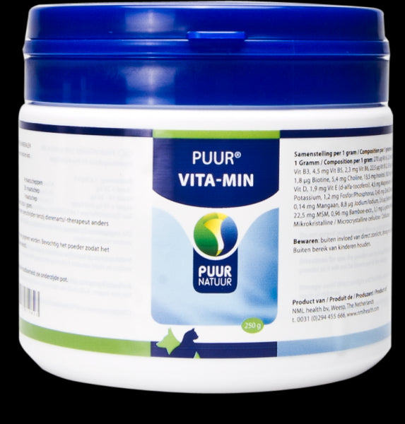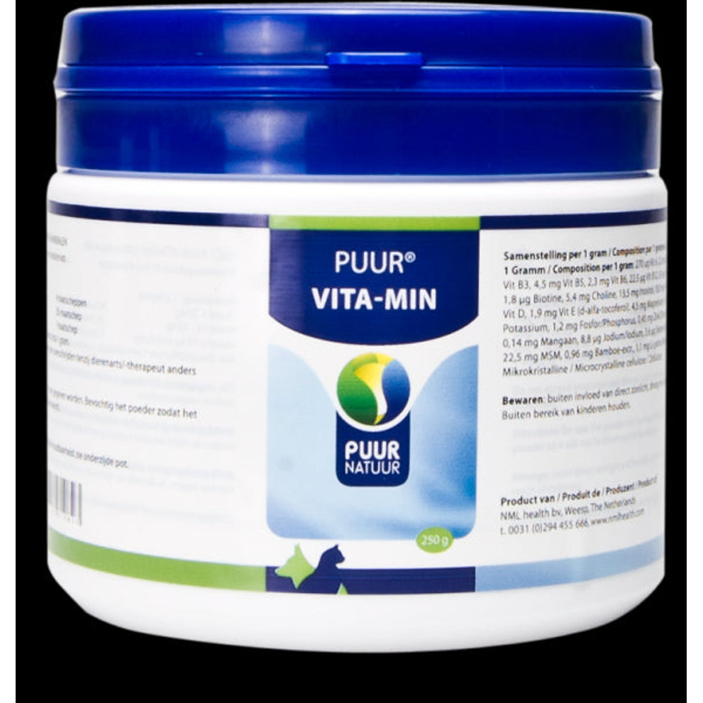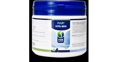PUUR Vita-Min / Vitaminen en Mineralen is een aanvullend diervoeder voor honden en katten ter ondersteuning van het immuunsysteem en herstel, tijdens of na ziekte.