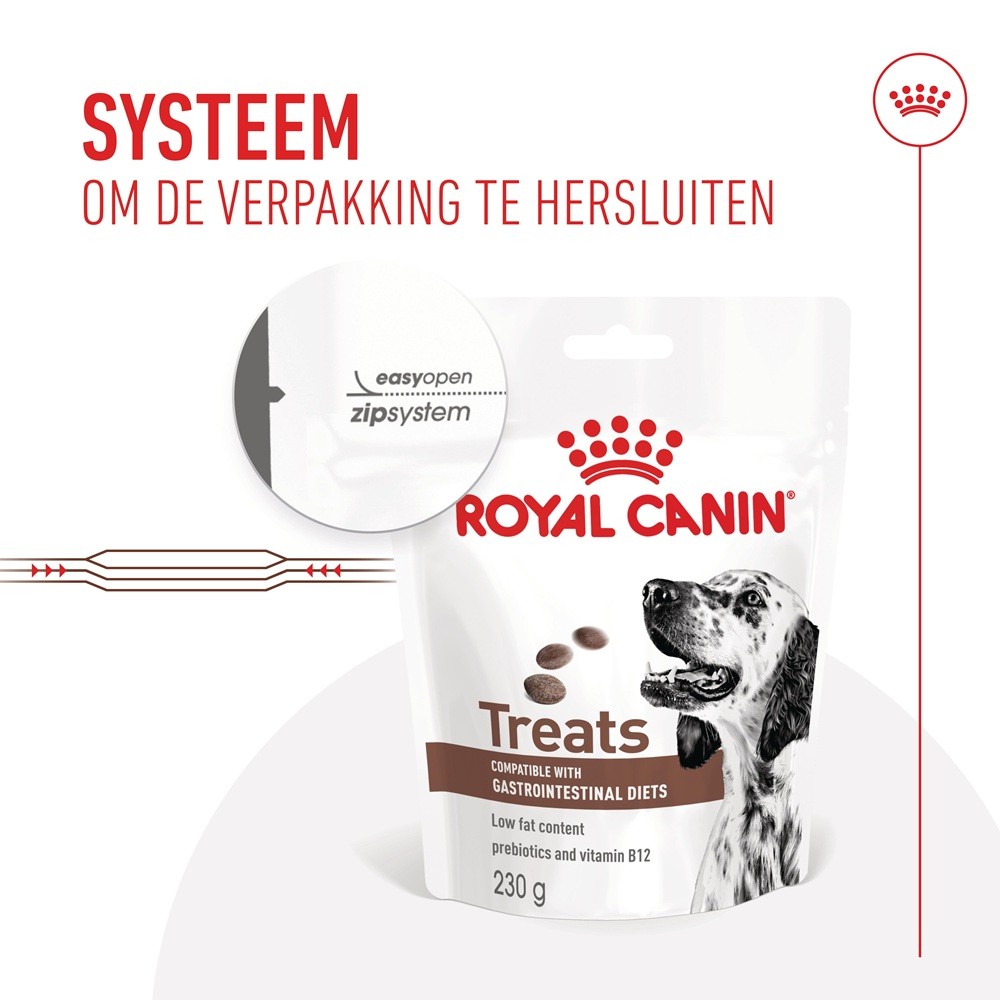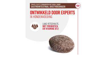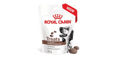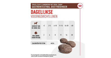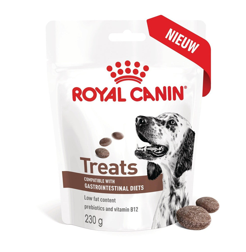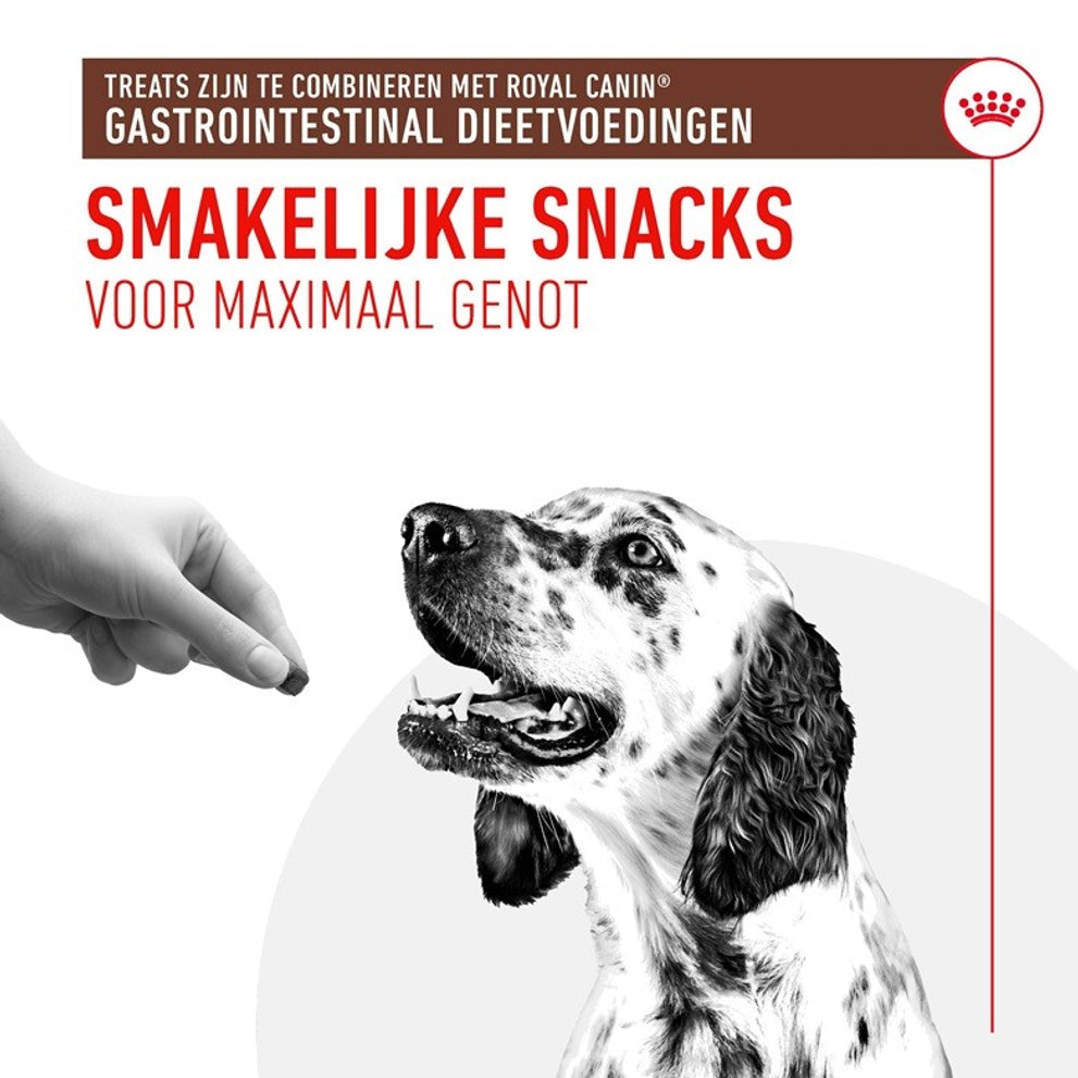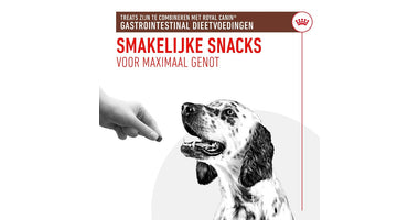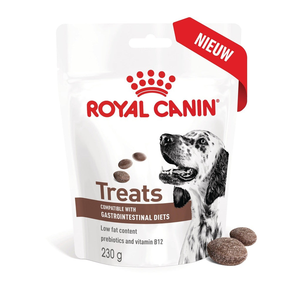 Royal Canin Gastrointestinal Treats zijn laag in vet en ontwikkeld met prebiotica en vitamine B12, waardoor ze een geschikte keuze zijn voor honden ter ondersteuning van de spijsvertering.