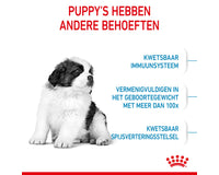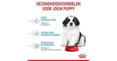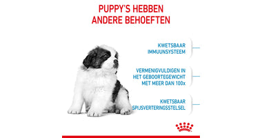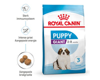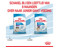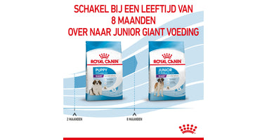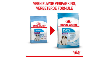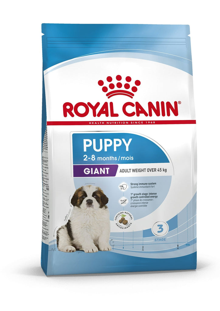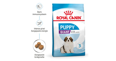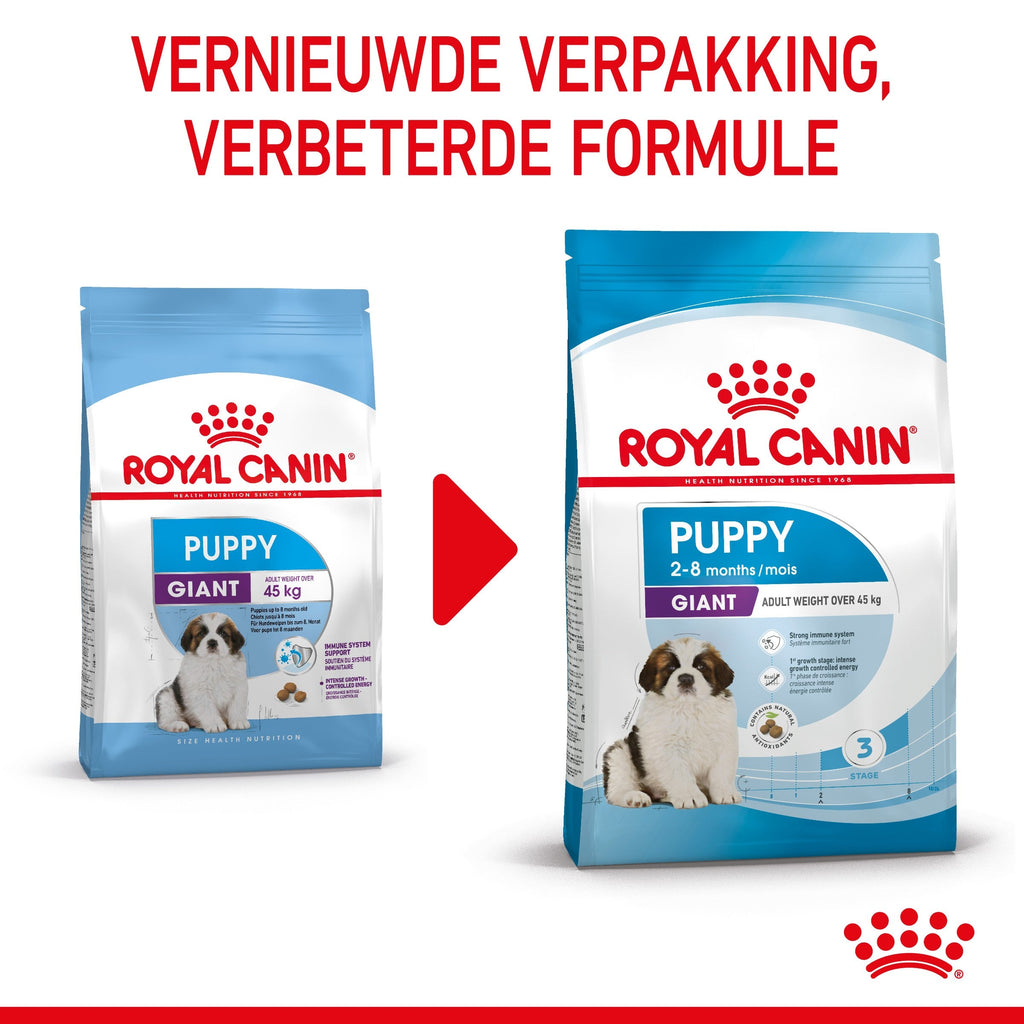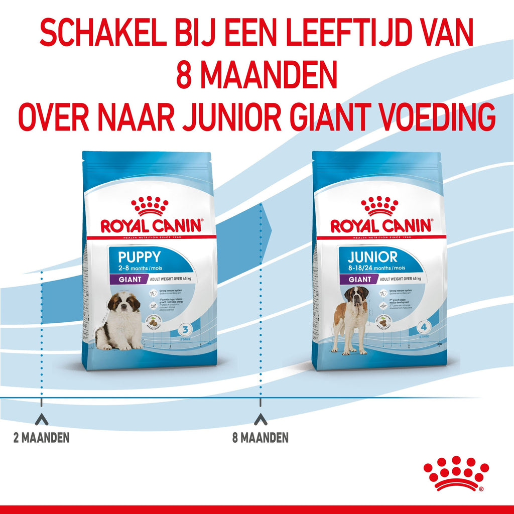 Royal Canin Giant Puppy bevat uitgebalanceerde voedingsstoffen om de intensieve groeiperiode van puppy's van zeer grote rassen tussen 2 en 8 maanden te ondersteunen, en helpt de kans op ongewenste gewichtstoename te verminderen.