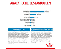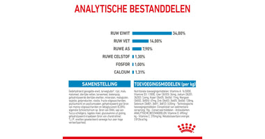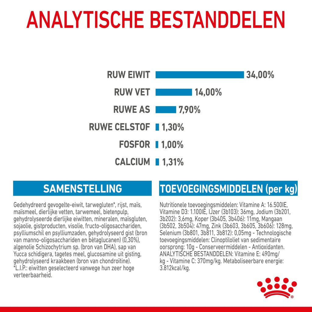 Gedehydreerde gevogelte-eiwitten, Tarwegluten*, Rijst, Maïs, Maïsmeel, Dierlijke vetten, Tarwemeel, Bietenpulp, Gehydrolyseerdedierlijke eiwitten, Mineralen, Maïsgluten, Sojaolie, Gistproducten, Visolie, Fructo-oligosacchariden, Psylliumschil en Psylliumzaden, Gehydrolyseerd gist (bron van Manno-oligosacchariden en Bèta-glucanen) (0.30%), Algenolie Schizochytrium sp. (bron van DHA), Sap van Yucca schidigera, Tagetes meel, Glucosamine uit gisting, Gehydrolyseerd kraakbeen (bron van Chondroïtine)