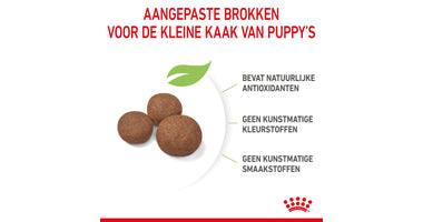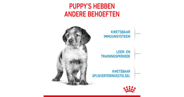 Het product is verrijkt met omega 3-vetzuren (DHA), waarvan wetenschappelijk bewezen is dat ze een gezonde ontwikkeling van de hersenen bij puppy's helpen ondersteunen. Dankzij een combinatie van prebiotica (MOS) en hoogverteerbare eiwitten helpt Royal Canin Medium Puppy ook een gezond evenwicht van de darmflora te ondersteunen voor een gezonde spijsvertering.