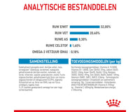 Gedehydreerde gevogelte-eiwitten, Dierlijke vetten, Gedehydreerde runder-en varkenseiwitten, Maïs, Tarwemeel, Bietenpulp, Rijst, Gehydrolyseerde dierlijke eiwitten, Maïsmeel, Tarwe, Maïsgluten, Tarwegluten*, Mineralen, Sojaolie, Gistproducten, Visolie, Fructo-oligosacchariden, Gehydrolyseerd gist (bron van Manno-oligosacchariden en Bèta-glucanen) (0.29%), Algenolie Schizochytrium sp. (bron van DHA), Sap van Yucca schidigera, Tagetes meel