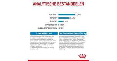 Ruw eiwit 32.0%, Ruw vet 20.0%, Ruwe as 8.2%, Ruwe celstof 1.7%, Omega-3 vetzuur (DHA) 0.17%, Vitamine E 500mg/kg, Vitamine C 400mg/kg. Metaboliseerbare energie: 4.102kcal/kg.