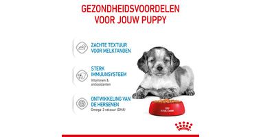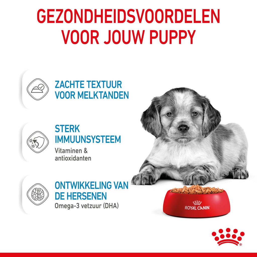 Deze uitgebalanceerde voeding is verrijkt met omega 3-vetzuren (DHA), waarvan wetenschappelijk bewezen is dat ze een gezonde ontwikkeling van de hersenen bij puppy's helpen ondersteunen. Dankzij een combinatie van prebiotica (MOS) en hoog verteerbare eiwitten helpt Royal Canin Medium Puppy in saus ook een gezond evenwicht van de darmflora te ondersteunen voor een gezonde spijsvertering.