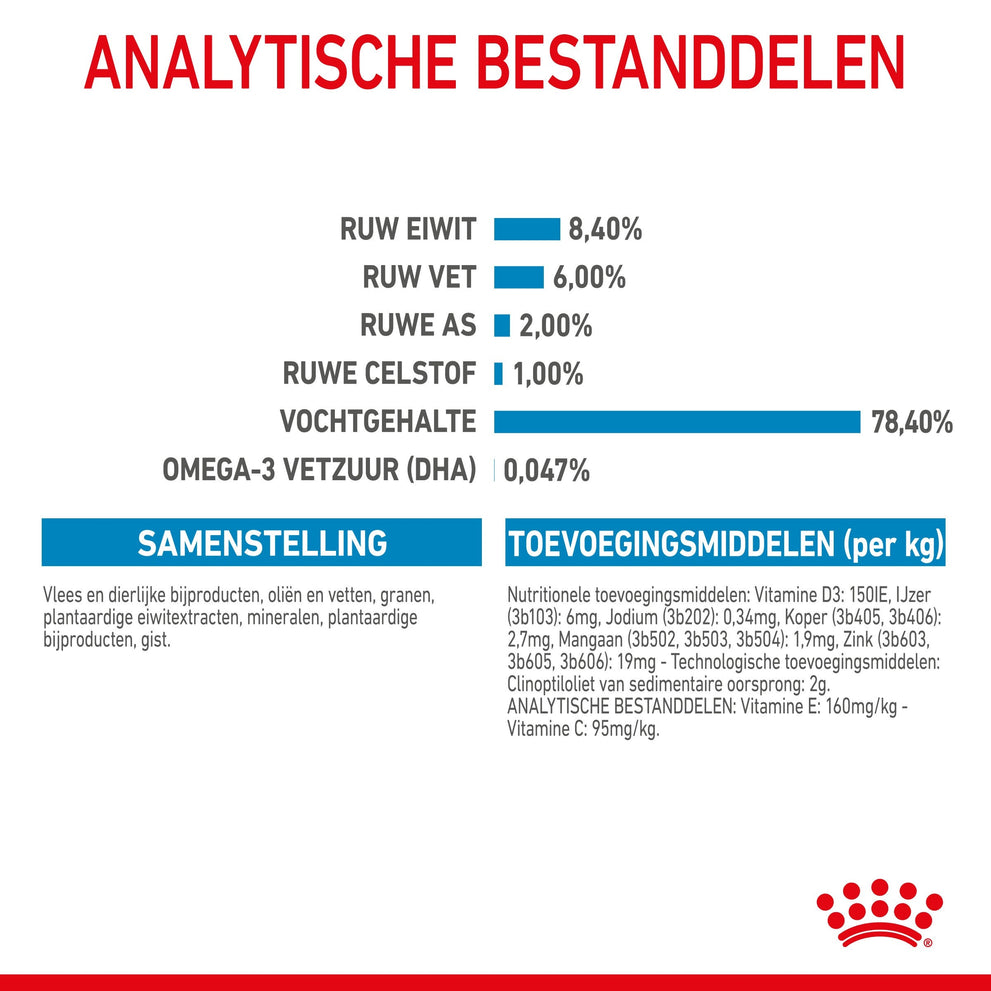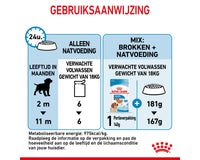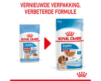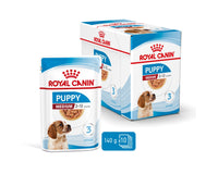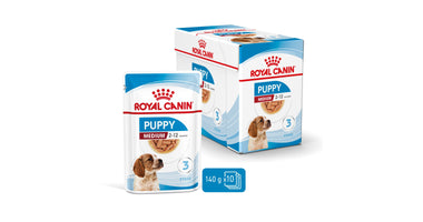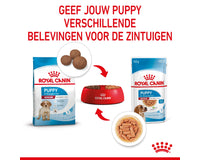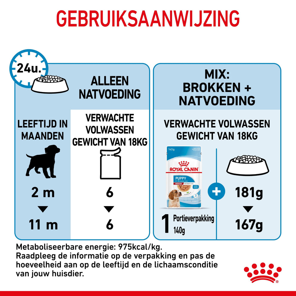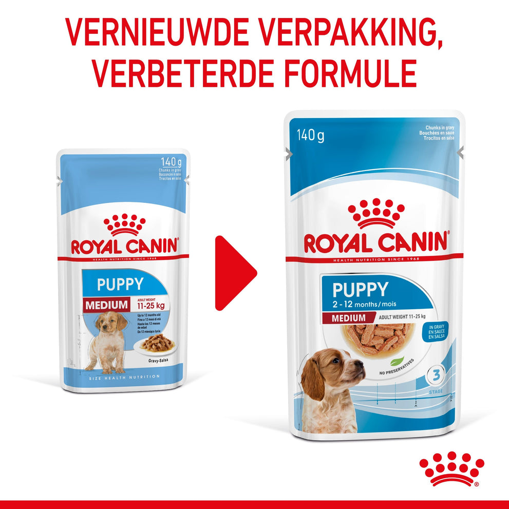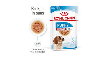 Royal Canin Medium Puppy in saus is speciaal samengesteld om de voedingsbehoeften van puppy's van middelgrote rassen te ondersteunen. Deze formule is geschikt voor puppy's van 2 tot 12 maanden die naar schatting een volwassen gewicht van 11 tot 25 kg zullen bereiken.