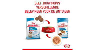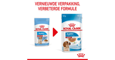 Royal Canin Medium Puppy in saus is ontwikkeld om zelfs bij de meest kieskeurige honden in de smaak te vallen. Deze natvoeding biedt een positieve zintuiglijke ervaring, ondersteunt een gezonde hydratatie en kan perfect gecombineerd worden met droogvoeding van Royal Canin Medium Puppy.