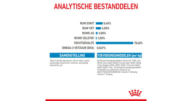 Ruw eiwit 8.4%, Ruw vet 6.0 %, Ruwe as 2.0%, Ruwe celstof 1.0 %, Vochtgehalte 78.4 %, Omega-3 vetzuur (DHA) 0.047 %, Vitamine E 160mg/kg, Vitamine C 95mg/kg.
