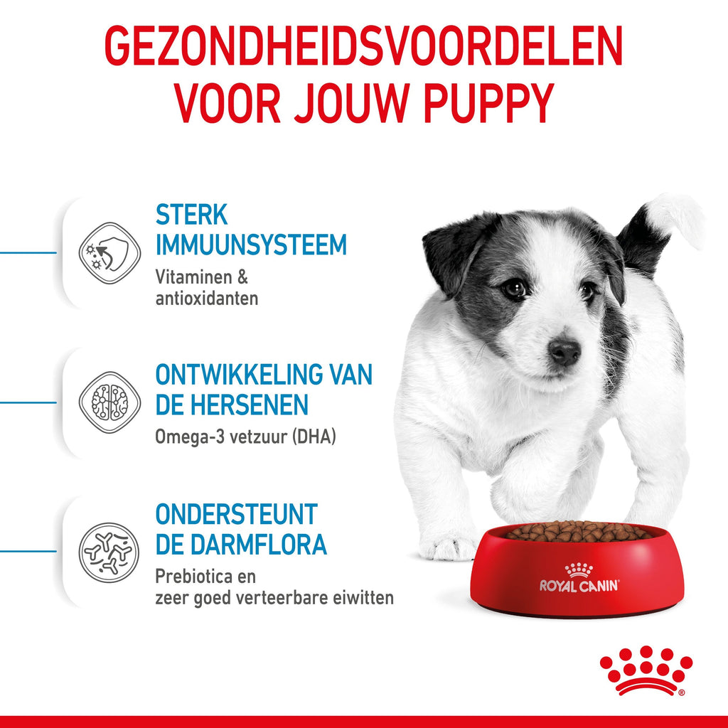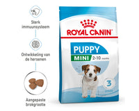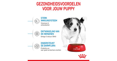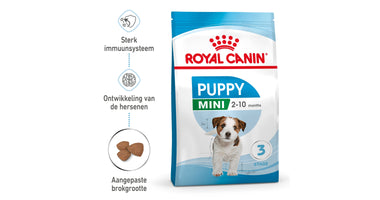 Deze formule bevat een complex van voedingsstoffen met vitamine C en E om een gezonde ontwikkeling van het immuunsysteem te ondersteunen.Dankzij een combinatie van prebiotica (MOS) en hoogverteerbare eiwitten helpt Royal Canin Mini Puppy ook een gezond evenwicht van de darmflora te ondersteunen voor een gezonde spijsvertering. De brokvorm is bovendien speciaal ontworpen voor de kleine kaken van je puppy, zodat die de brok makkelijk kan oppakken en kauwen.