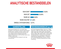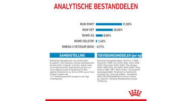 Gedehydreerde gevogelte-eiwitten, Rijst, Dierlijke vetten, Tarwegluten*, Maïs, Gedehydreerde runder-en varkenseiwitten, Bietenpulp, Maïsmeel, Gehydrolyseerde dierlijke eiwitten, Mineralen, Maïsgluten, Sojaolie, Visolie, Fructo-oligosacchariden, Gehydrolyseerd gist (bron van Manno-oligosacchariden en Bèta-glucanen) (0.30%), Algenolie Schizochytrium sp. (bron van DHA), Sap van Yucca schidigera, Tagetes meel.