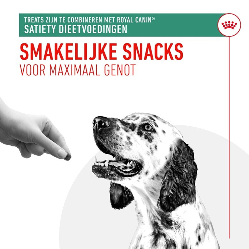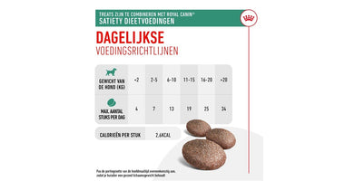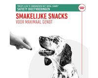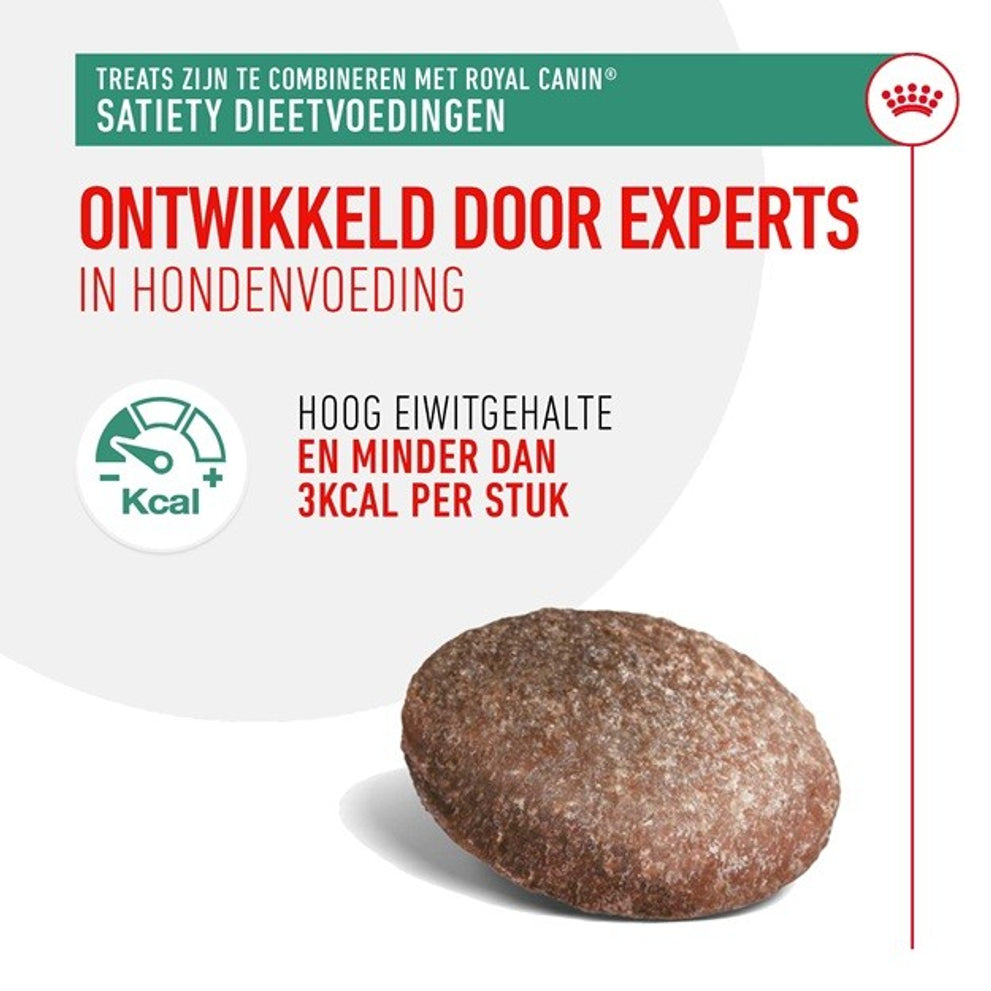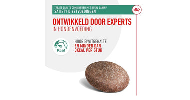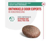 Royal Canin Satiety Treats bevatten minder dan 3 calorieën per snack en bevatten een hoog eiwitgehalte, waardoor ze een geschikte keuze zijn voor honden die een gewichtsbeheersing dieetvoeding nodig hebben.