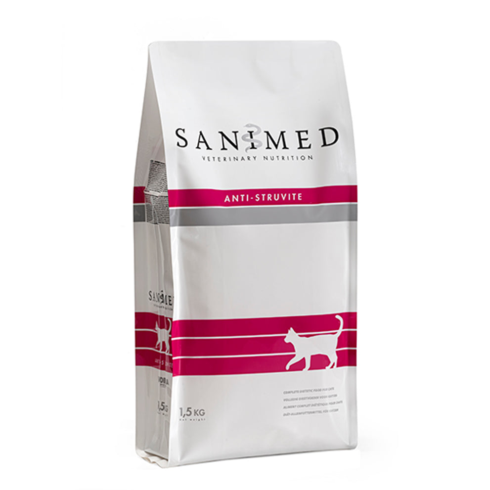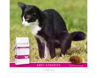 Sanimed Anti-struvite ondersteunt bij het oplossen van blaasgruis en blaasstenen en helpt bij een gezond milieu in de blaas. Struviet is één van de meest voorkomende blaassteensoorten. Blaasstenen kunnen bij uw kat resulteren in pijn bij het plassen, vaak kleine beetjes plassen, persen bij het plassen, in huis plassen, bloederige urine of zelfs niet meer kunnen plassen.