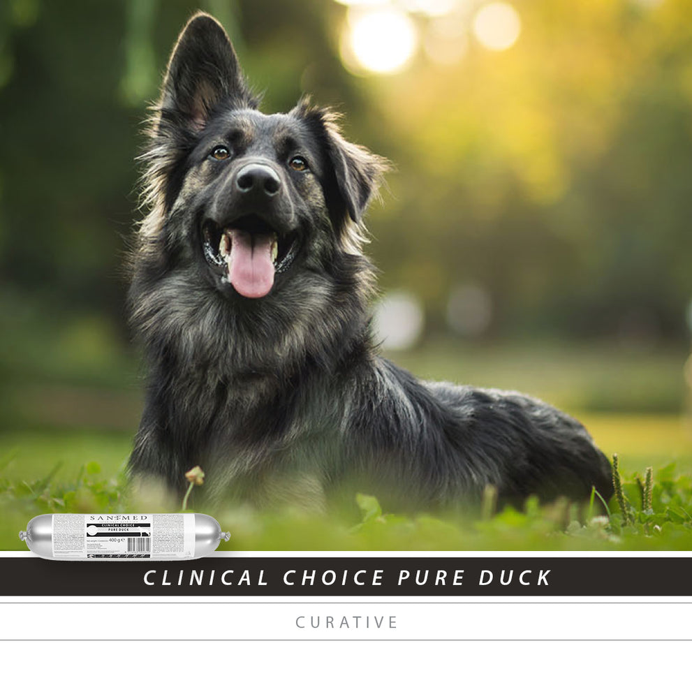 Sanimed Clinical Choice Pure Duck is een volledig dieetvoeder voor honden met een overgevoeligheid of intolerantie voor bepaalde voedingsstoffen en/of ingrediënten.