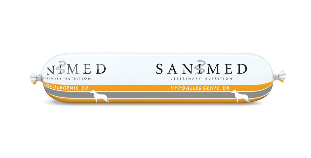 Sanimed Hypoallergenic DR is een volledige dieetvoeding voor honden ter vermindering van voedselovergevoeligheid- en intoleranties. Deze worst helpt een ongewenste reactie op voeding verminderen, dankzij slechts één intacte dierlijke eiwitbron (eend) en hypoallergene plantaardige eiwitbronnen.