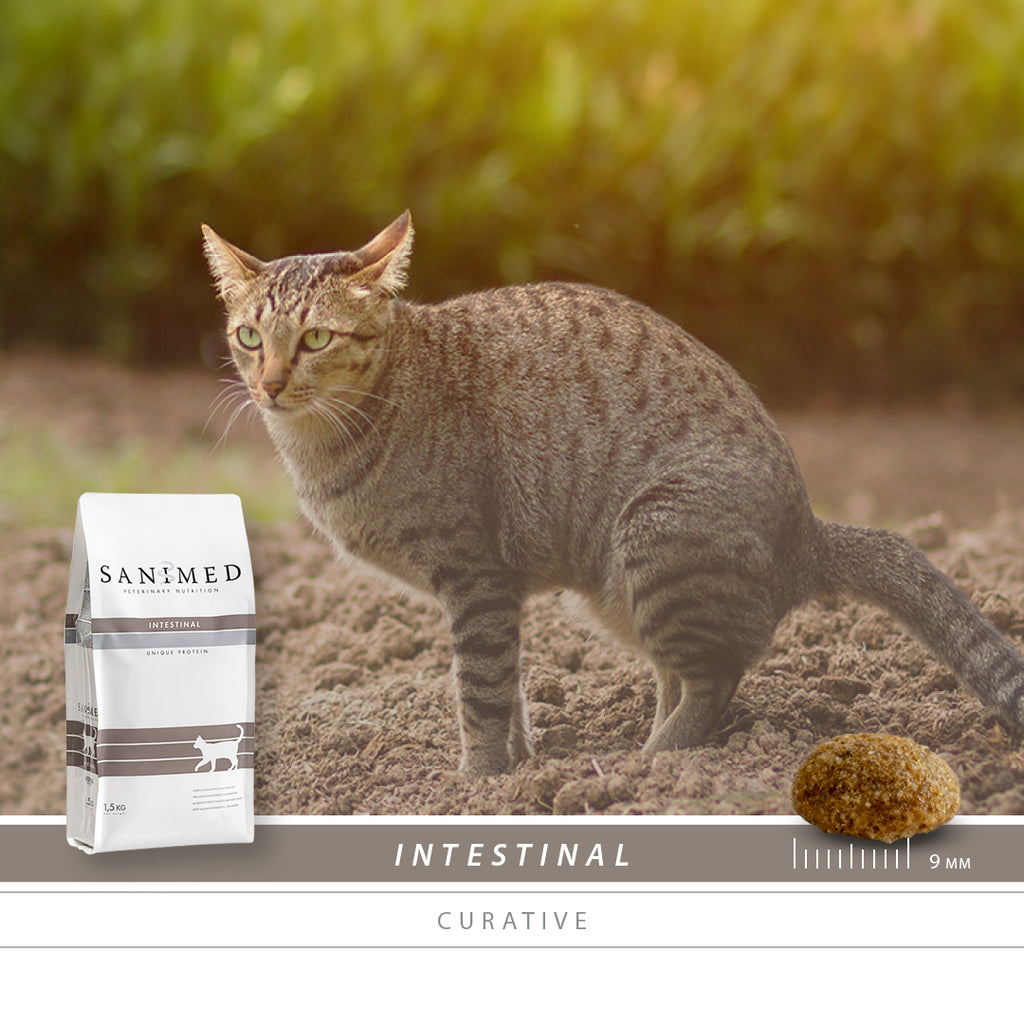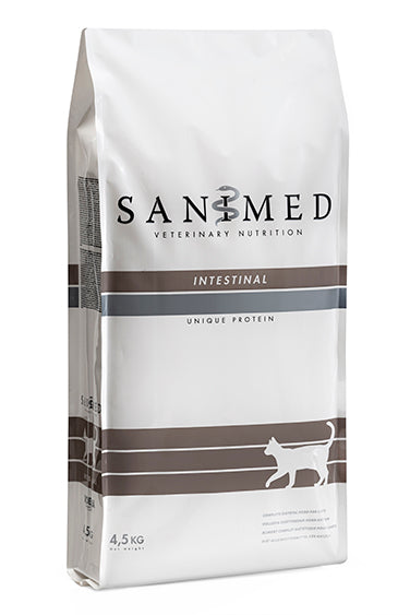 Sanimed Intestinal biedt ondersteuning bij een verslechterde spijsvertering, dunne ontlasting en overgevoeligheid. Bij overgevoeligheid voor een bepaalde voedingsstof kan het helpen om voeding met één specifieke dierlijke eiwitbron te geven. Sanimed Intestinal bevat alleen insect als intacte dierlijke eiwitbron. Dit helpt intoleranties voor bepaalde ingrediënten en voedingsstoffen te verminderen.