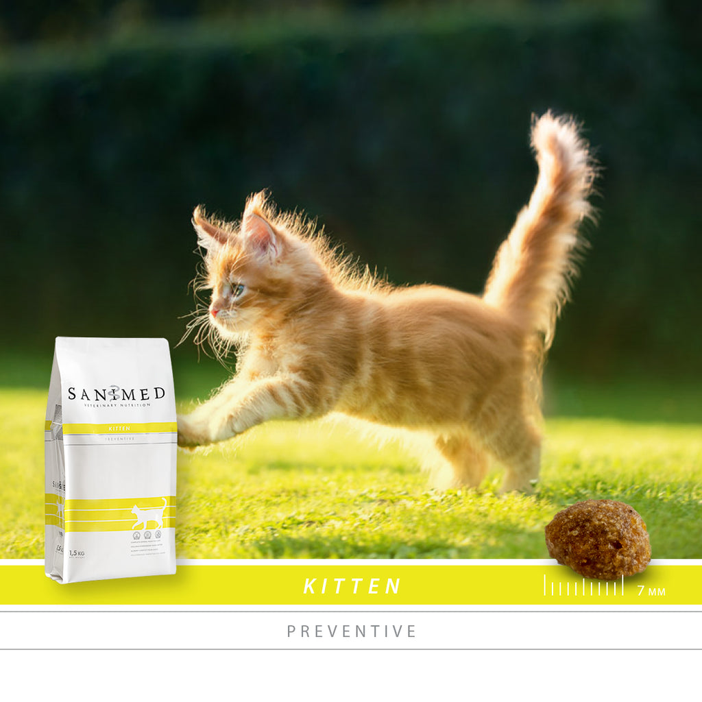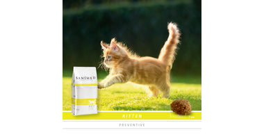 Sanimed Kitten brokken ondersteunen een optimale groei, versterken het immuunsysteem en stimuleren een gezonde conditie van huid en vacht dankzij het hoge omega 3- vetzuurgehalte. Bovendien ondersteunt Sanimed Kitten een gezond milieu in de blaas, dankzij de lage pH-waarde van de urine.