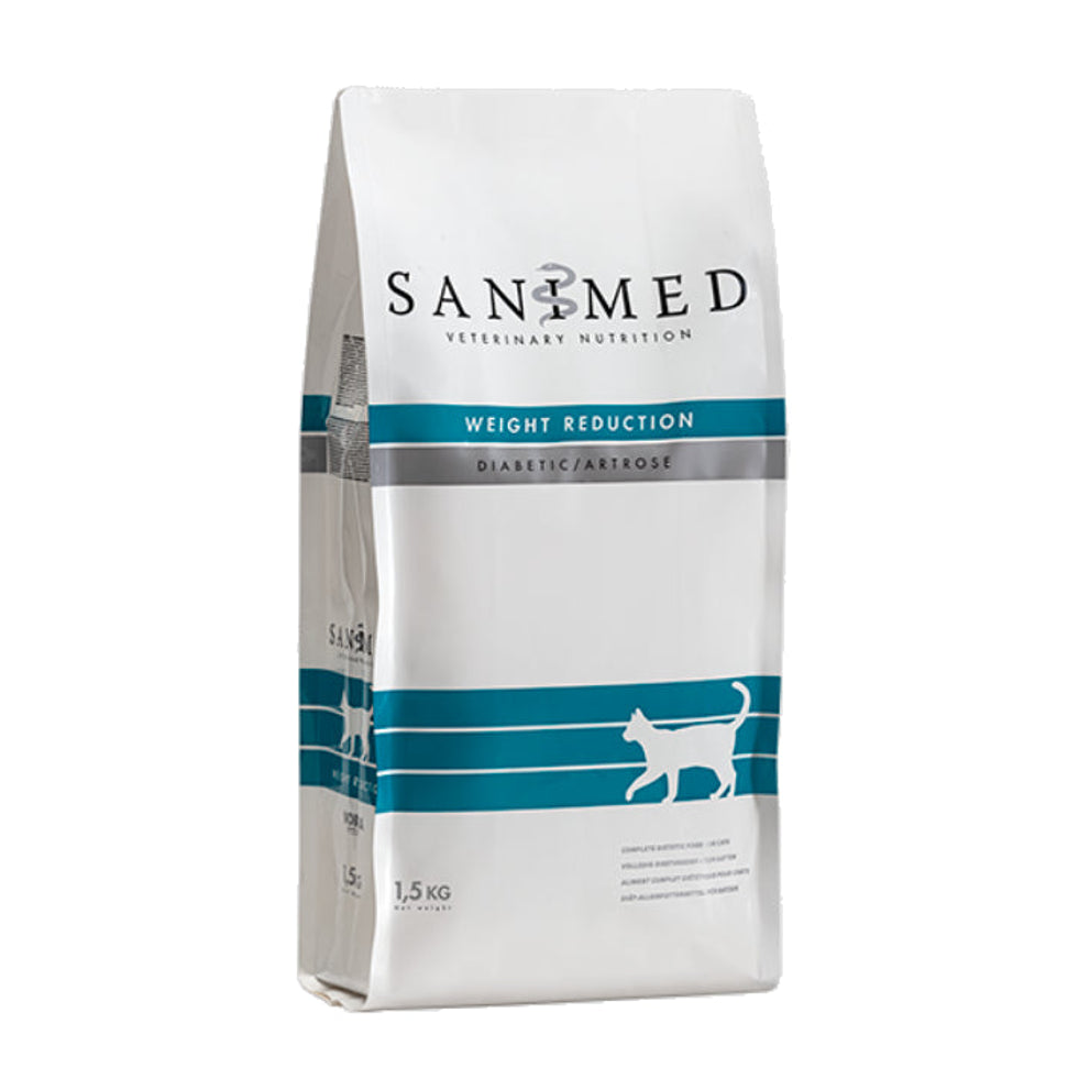 Met SANIMED Weight Reduction kunt u uw kat op een verantwoorde manier gewicht laten verliezen. Door de combinatie van een laag vetgehalte en een hoog gehalte aan ruwe celstof (vezels), heeft SANIMED Weight Reduction een zeer lage energiewaarde. Dankzij het lage energiegehalte van deze voeding kunnen katten relatief veel voeding eten en toch afvallen. Bovendien stimuleert de toegevoegde L-carnitine de afbraak van vetten in het lichaam. De brokken bevatten ook goed verteerbare eiwitten waardoor tijdens het vermageren de spiermassa behouden blijft.