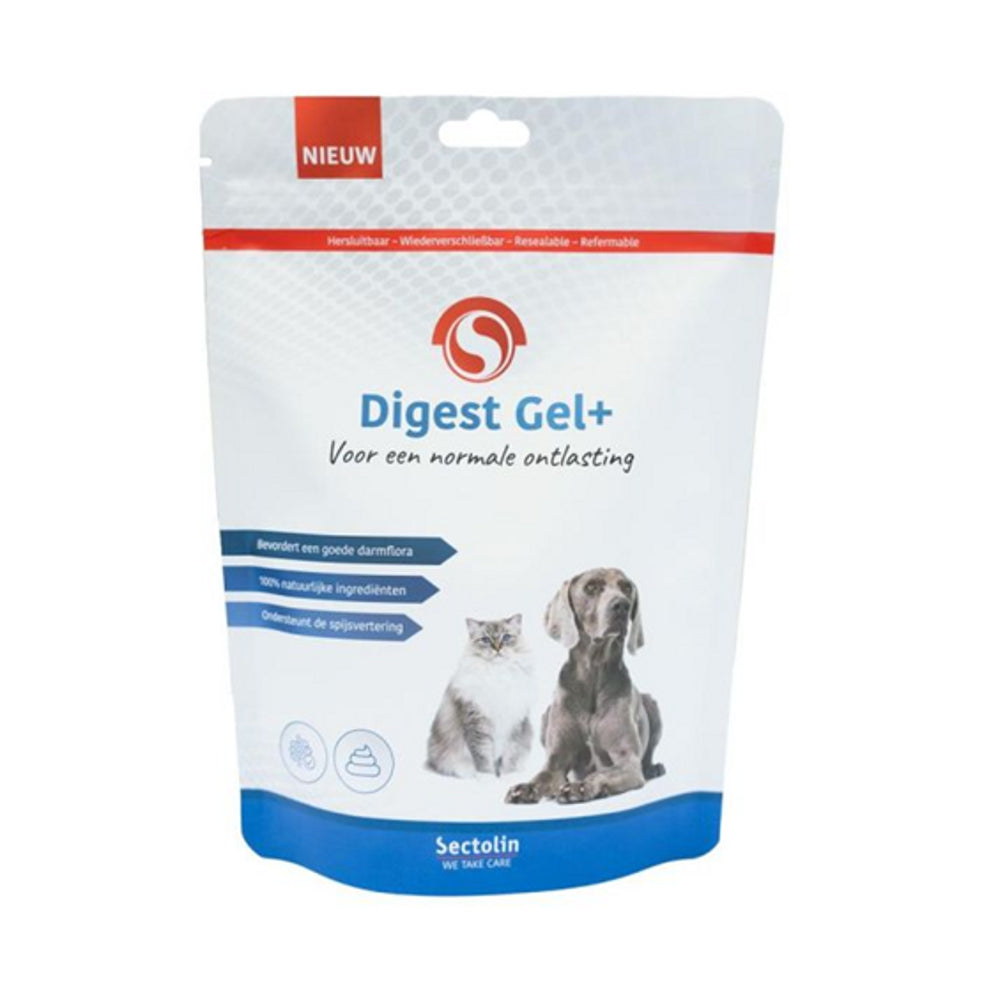Sectolin Digest Gel+ is een aanvullend diervoeder voor honden en katten. Sectolin Digest Gel+ zorgt voor een normale structuur van de ontlasting. De vezels vormen een gel bij contact met vocht, wat de darmwerking stimuleert en een normale doorvoer ondersteunt. Het werkt als prebioticum en bevordert de balans van een goede darmflora wat de opname van voedingsstoffen verbetert. Digest Gel+ stimuleert het immuunsysteem en helpt bij de verwijdering van schadelijke stoffen uit de darmen.