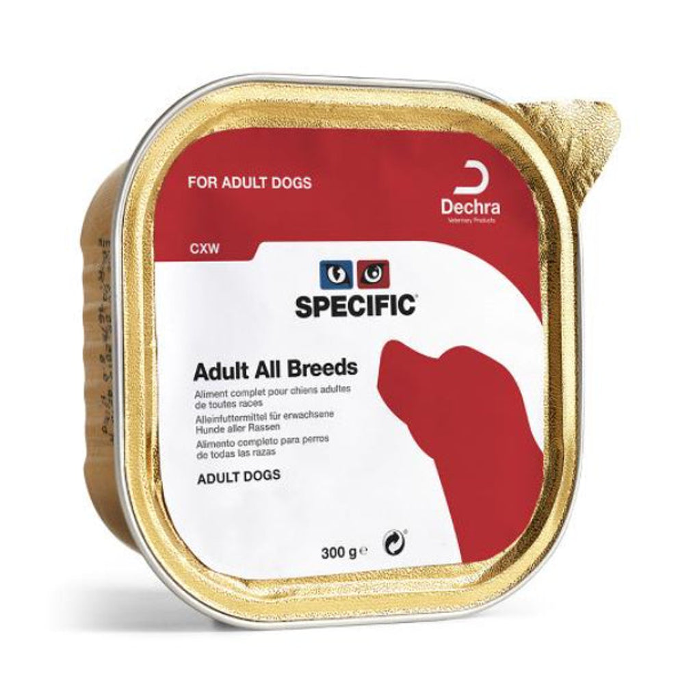 Specific All Breeds CXW is een complete natvoeding in patévorm voor volwassen honden van alle rassen. De voeding is rijk aan Omega-3 vetzuren die zorgen voor een gezonde vacht, huid en soepele gewrichten. De beperkte energiewaarde houden het ideale gewicht van de hond op peil. Daarnaast is er aan de voeding psyllium toegevoegd voor de ondersteuning van de spijsvertering. Het absorbeert vocht om de ontlasting steviger te maken en het helpt het spijsverteringsstelsel te reguleren.
