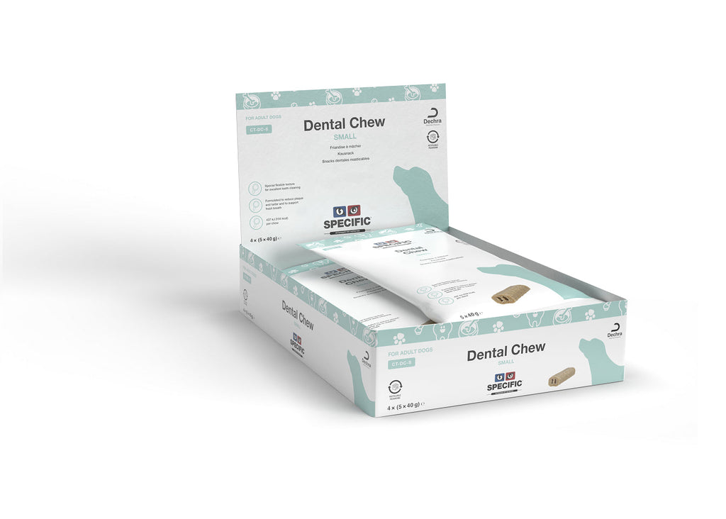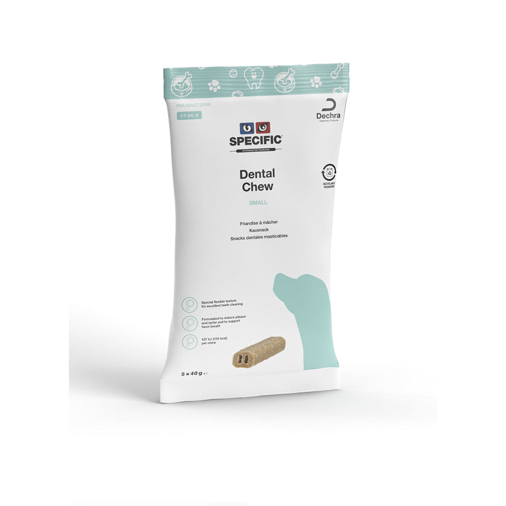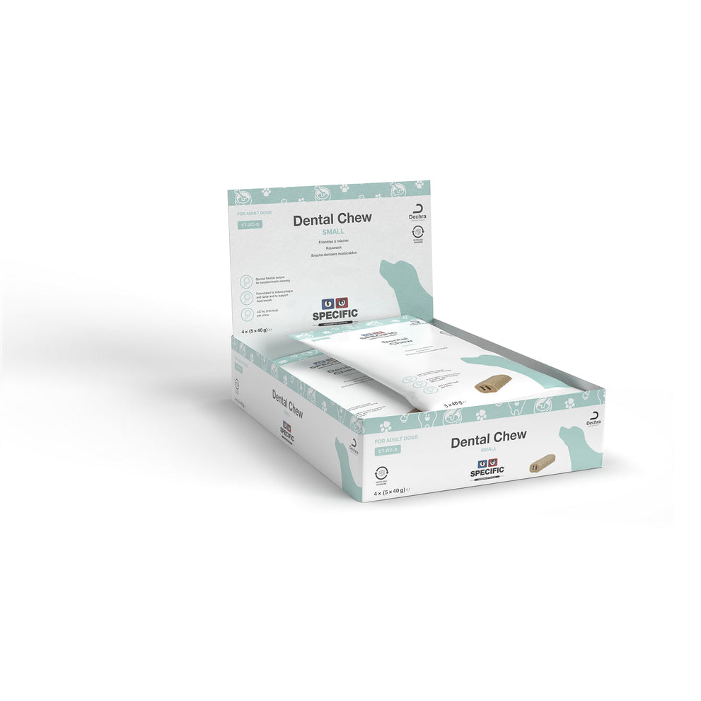 Smakelijk kauwstaafje voor een optimale mondgezondheid van volwassen honden met een lichaamsgewicht tot 15 kg. Dankzij de speciale flexibele textuur en open structuur van de Specfic chews kunnen de tanden diep in de kauwstaaf doordringen, waardoor de tanden worden schoon geschraapt.