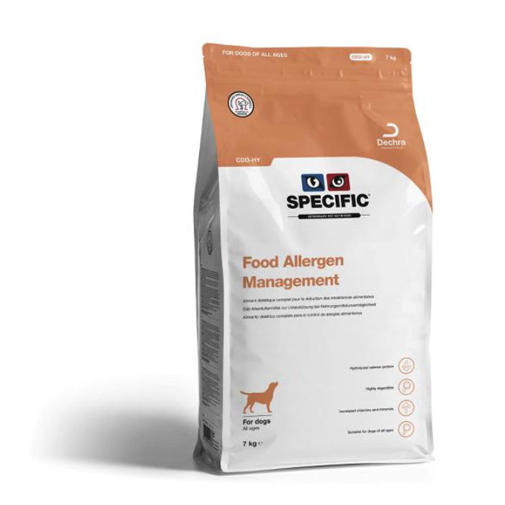 Het Specific Food Allergen Mangement CDD-HY is een dieetvoeding voor honden die te maken hebben een voedselallergie en/of -intolerantie maar ook bij allergische reacties op externe allergenen. Naast het gebruik van gehydrolyseerd zalmeiwitten bevat de voeding ook hoge gehaltes aan Omega-3 vetzuren ter ondersteuning van de huid en vacht. Daarnaast is de voeding ook zeer geschikt voor honden die last hebben van chronische diarree.