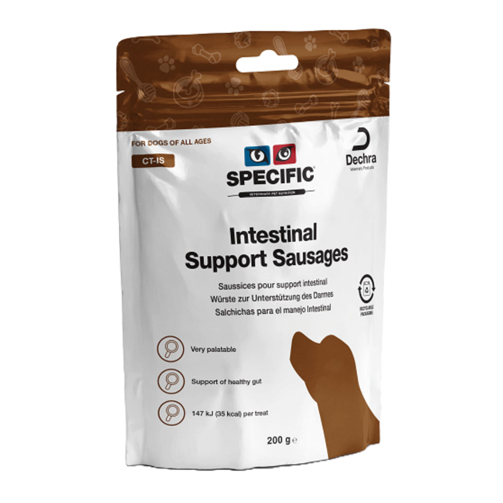 Specific Intestinal Support Sausages kunnen ingezet worden als een smakelijke beloning voor honden van alle leeftijden en rassen. De snack is speciaal samengesteld om een gezonde darmfunctie te ondersteunen. De Specific Intestinal Support Sausages zijn ideaal te combineren bij honden die het Specific Digestion Support CID of het Specific Digestion Support CIW dieet volgen.