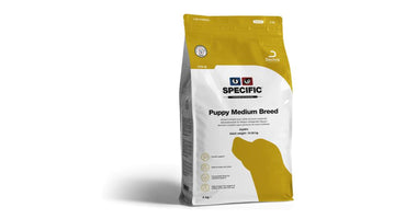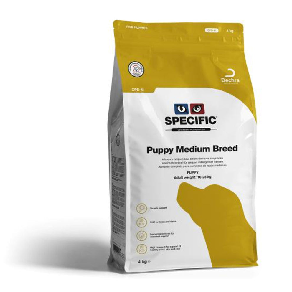 Specific Puppy Medium Breed CPD-M is een complete en uitgebalanceerde onderhoudsvoeding voor puppy’s van middelgrote rassen (10 t/m 25 kg). Het bevat alle vitaminen en mineralen die een pup nodig heeft voor een optimale groei. De voeding is rijk aan Omega-3 vetzuren die ondersteuning biedt aan de ontwikkeling van de ogen, hersenen, vacht, huid en gewrichten. Het calcium en fosfor gehalte van de Specific Puppy Medium Breed CPD-M is speciaal aangepast voor de optimale groei van de tanden en de botten.
