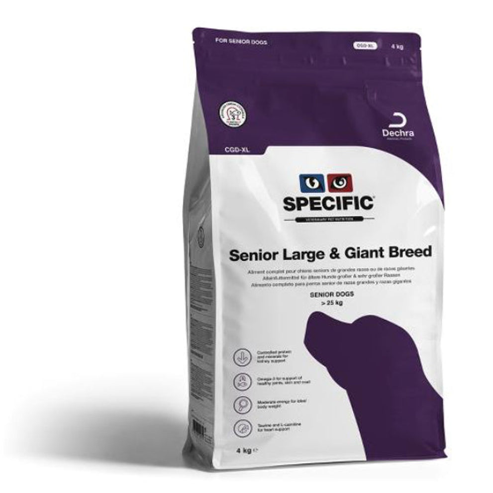 Specific Senior Large & Giant Breed CGD-XL is een complete en uitgebalanceerde voeding voor senior honden van grote rassen (> 25 kg). De brokken zijn van een extra groot formaat om de etensduur te verlengen en het kauwen te stimuleren.