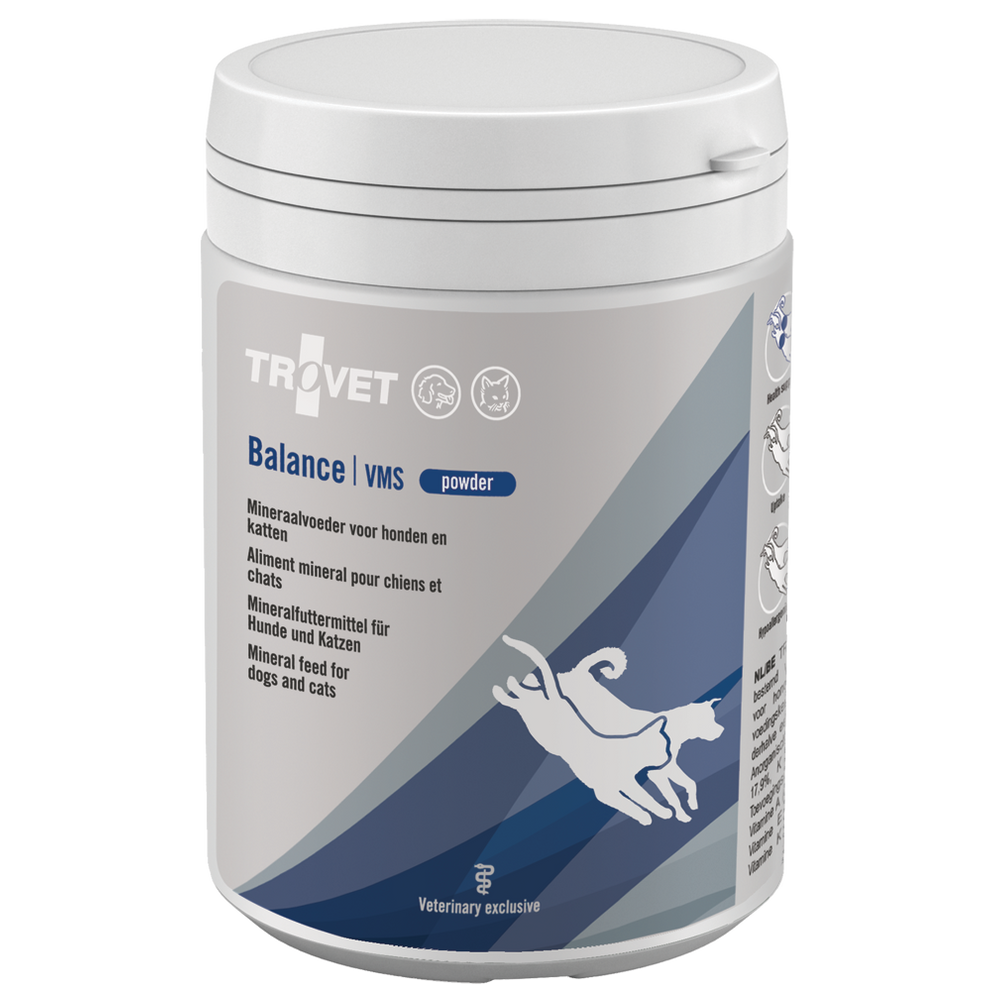 De Trovet Balance VMS is de ideale aanvulling voor zelfbereide en niet-toereikende voeding en kan zowel tijdelijk (tijdens een eliminatiefase), als levenslang (als aanvulling op een zelfbereide voeding) gegeven worden. Balance is hypoallergeen geformuleerd, heeft een neutrale smaak en is eenvoudig te doseren. De Trovet Balance VMS bevat alle benodigde vitaminen en mineralen in optimale verhouding en hoeveelheden.